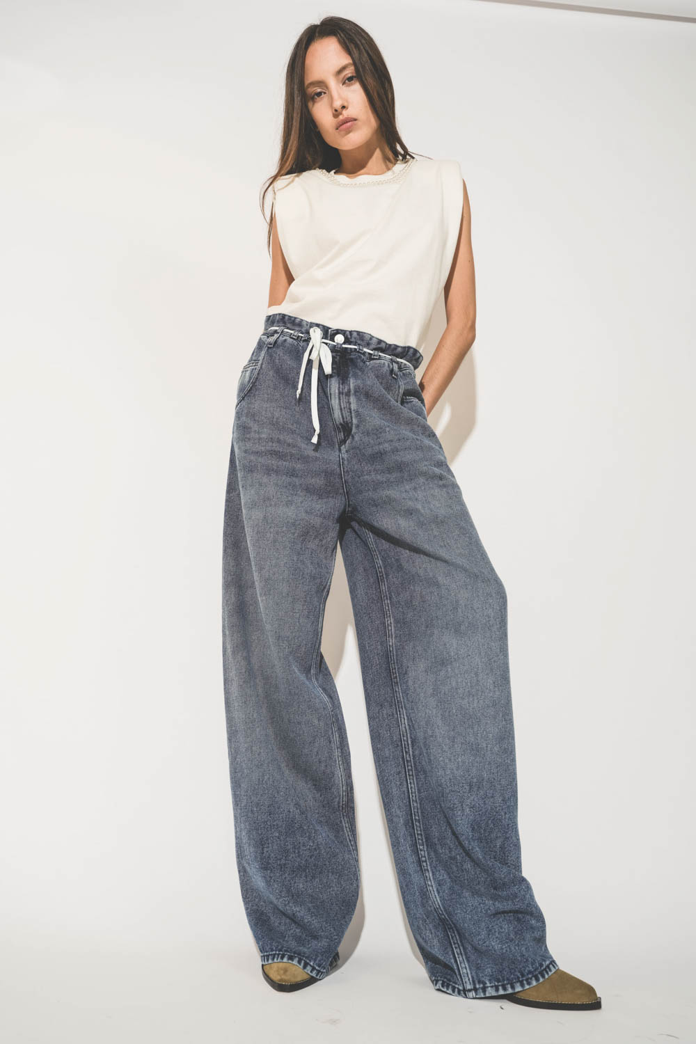 - High-waisted oversized jeans - Zip and button closure - Drawstring waist with belt loops - Five pockets - Fluid denim fabric - Loose fit - Composition: 70% lyocell 23% cotton