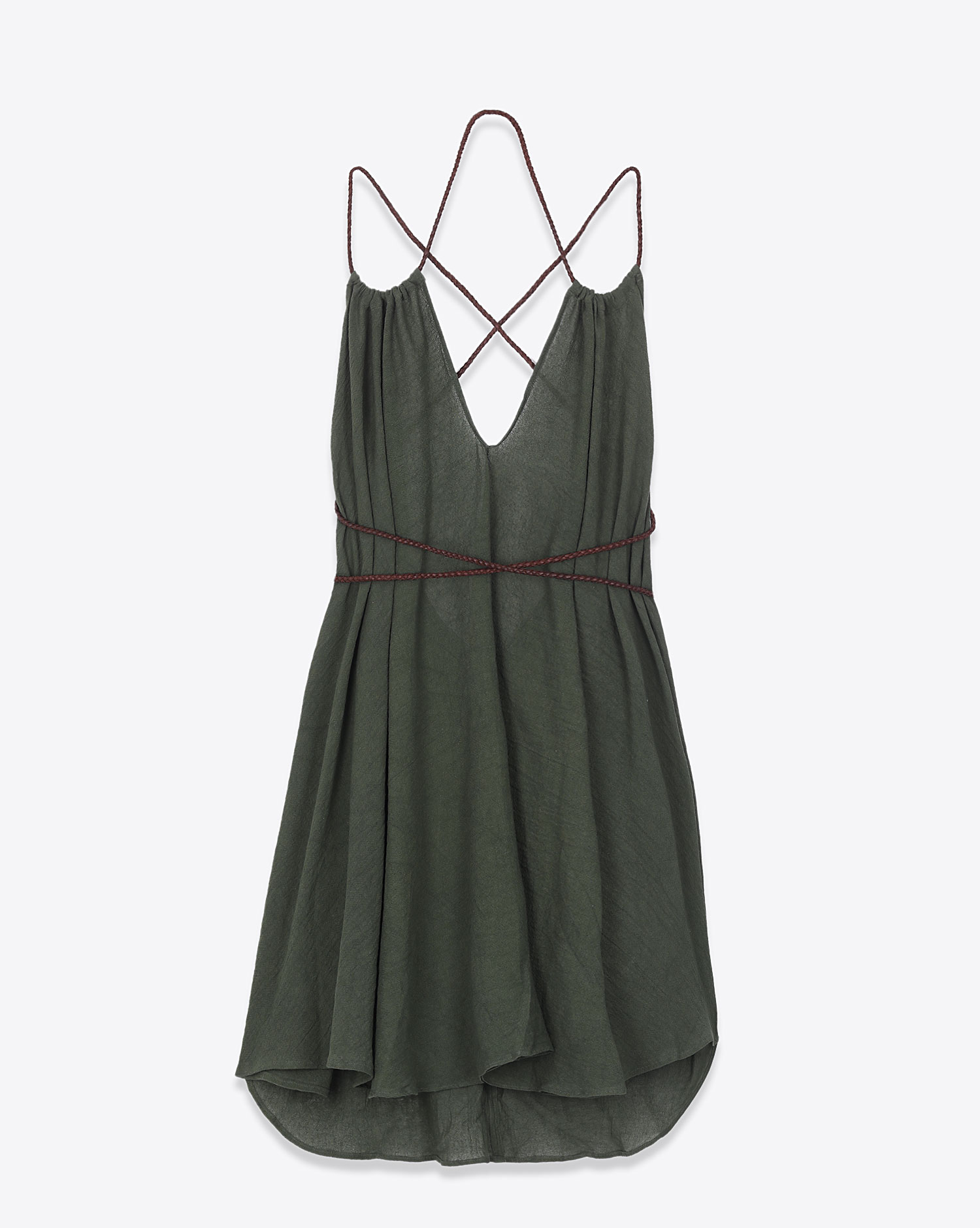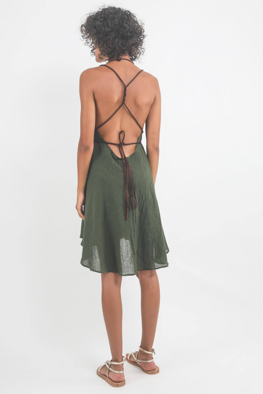 - Short dress - V-neck - Braided straps that cross at the back and around the waist - Cotton gauze - Longer in the back than in the front - One size fits all - Composition: 80% cotton 20% cowhide