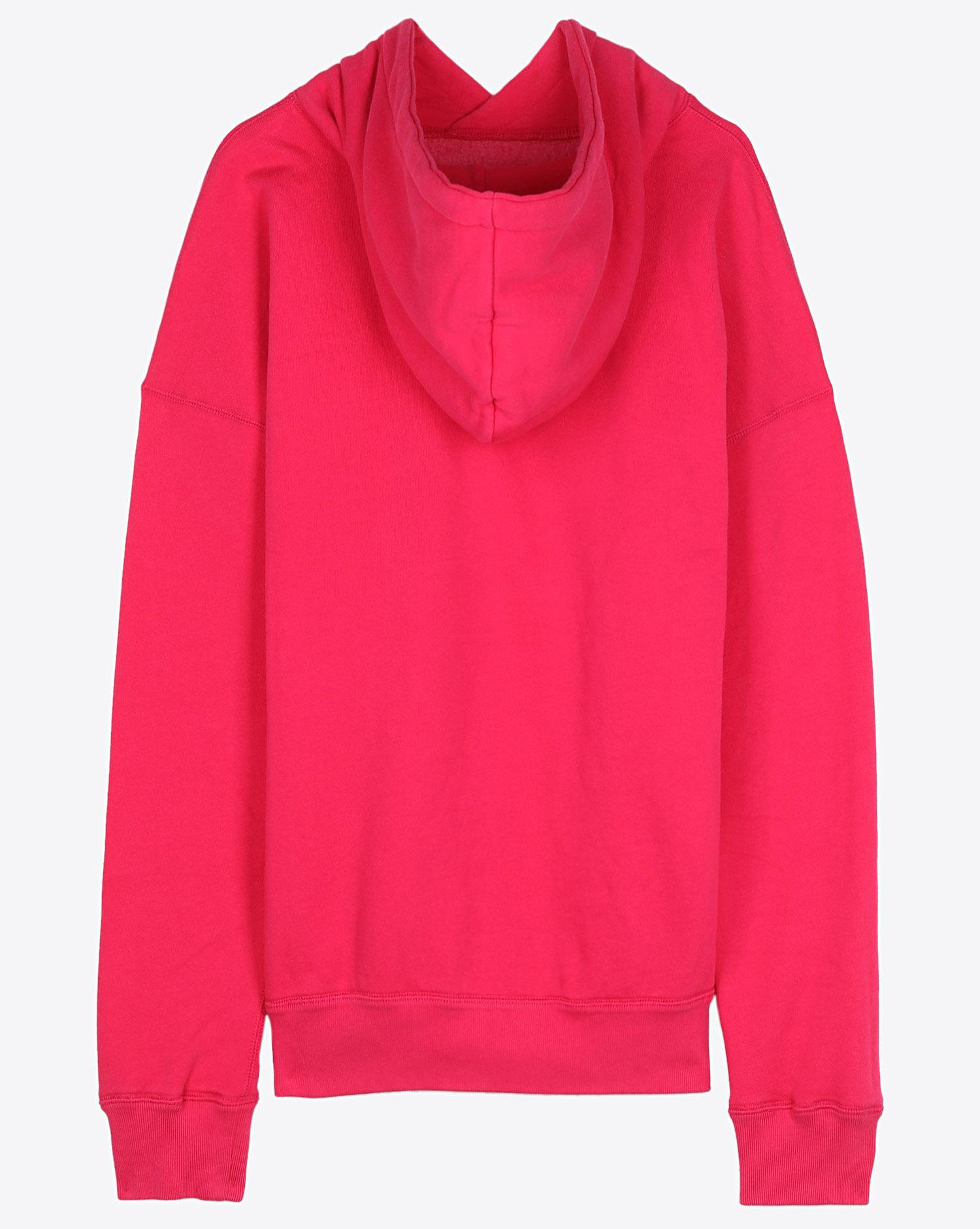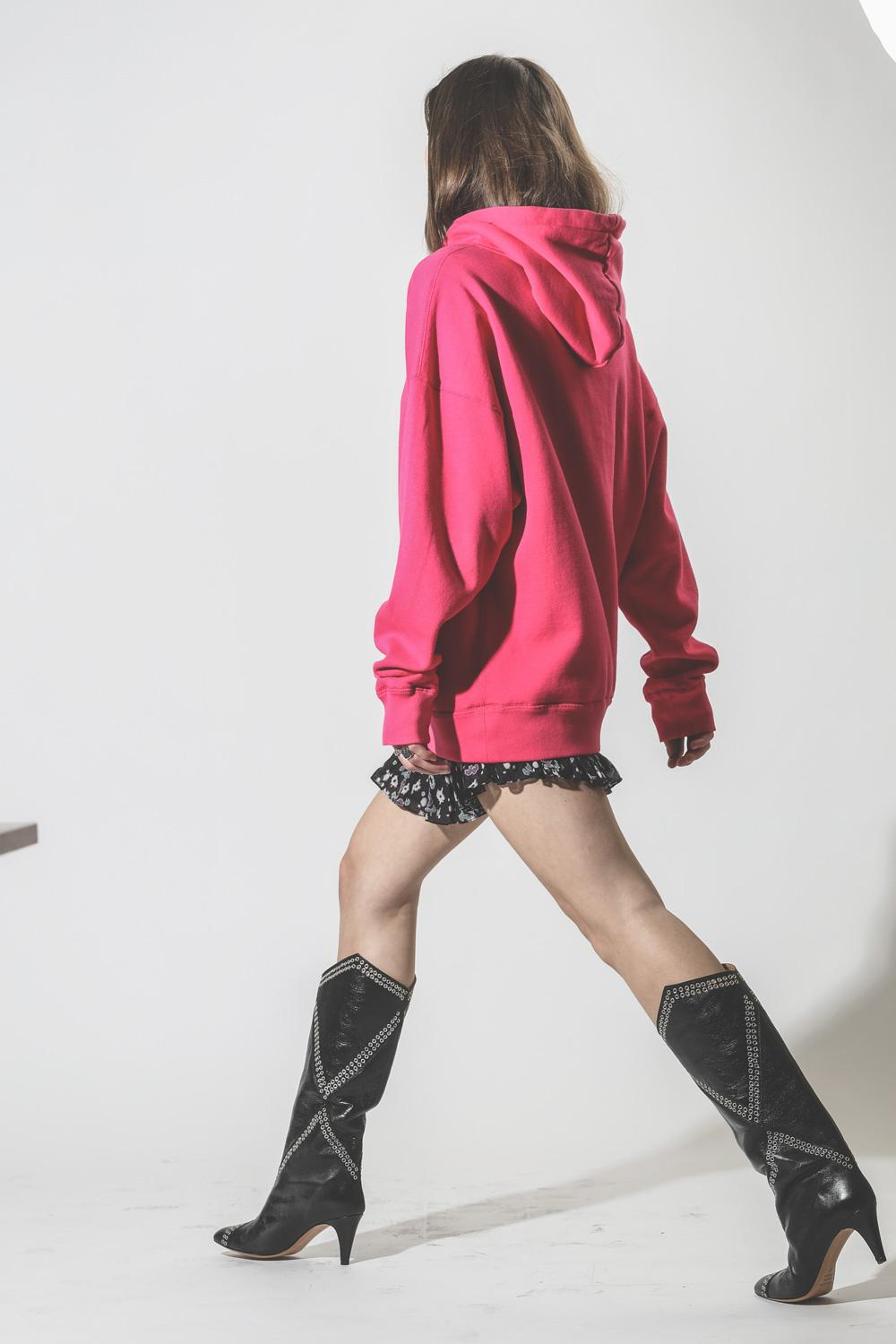 A must in the Isabel Marant Étoile catalog, the Mansel hooded sweatshirt seduces with the intensity of its pink hue and its oversized cut. We break its streetwear side by wearing it with a black mini skirt with ruffles in floral print, a small handbag with a chain strap, and a pair of high boots stamped with silver metal eyelets, like the Demka model by the same designer.