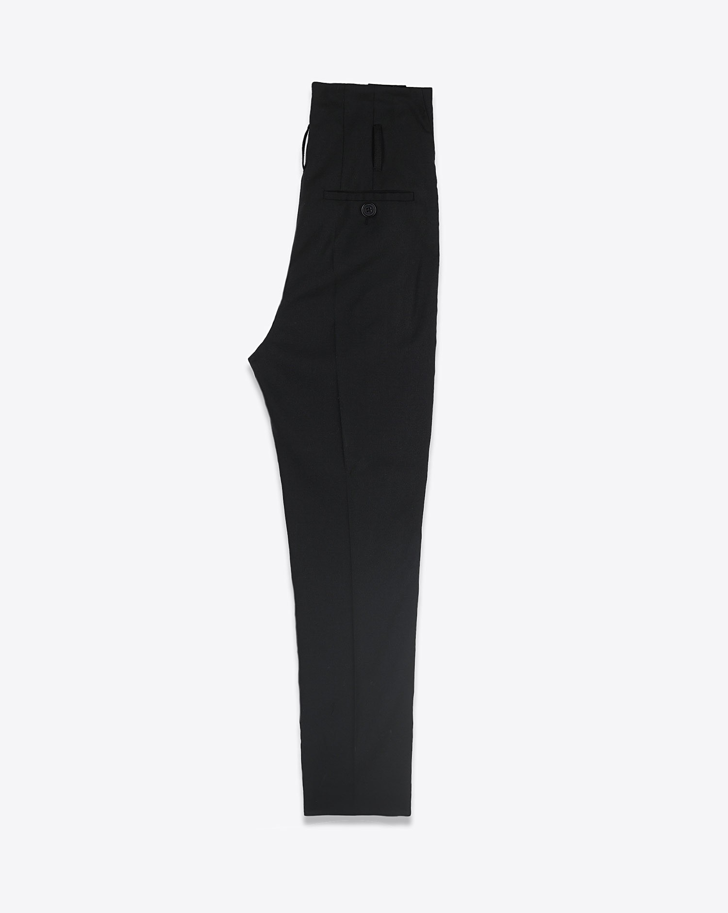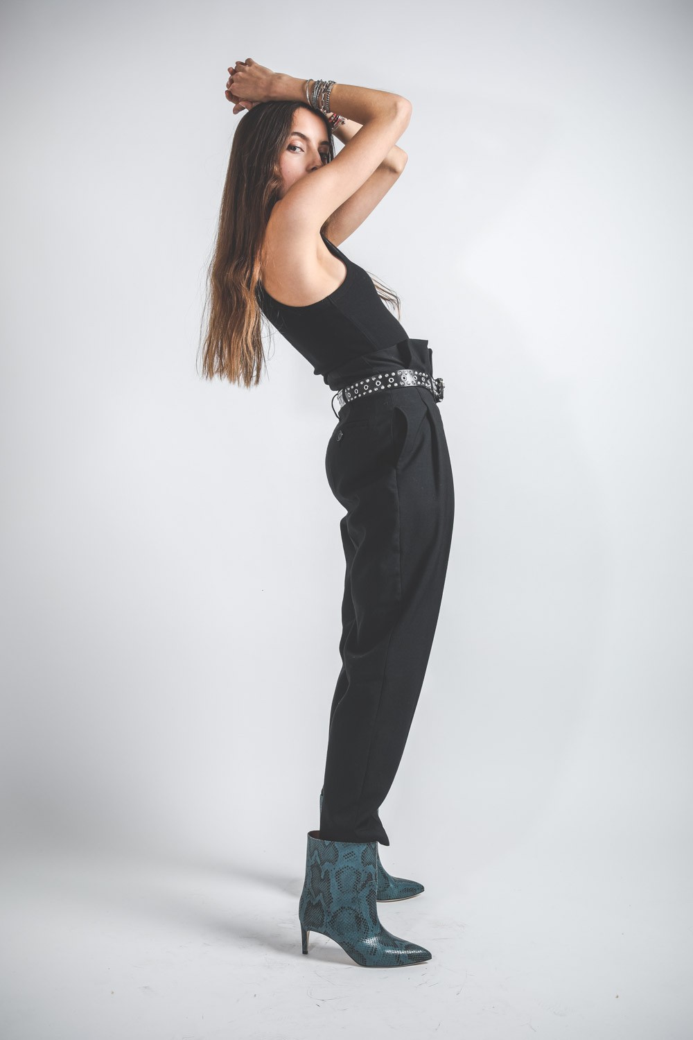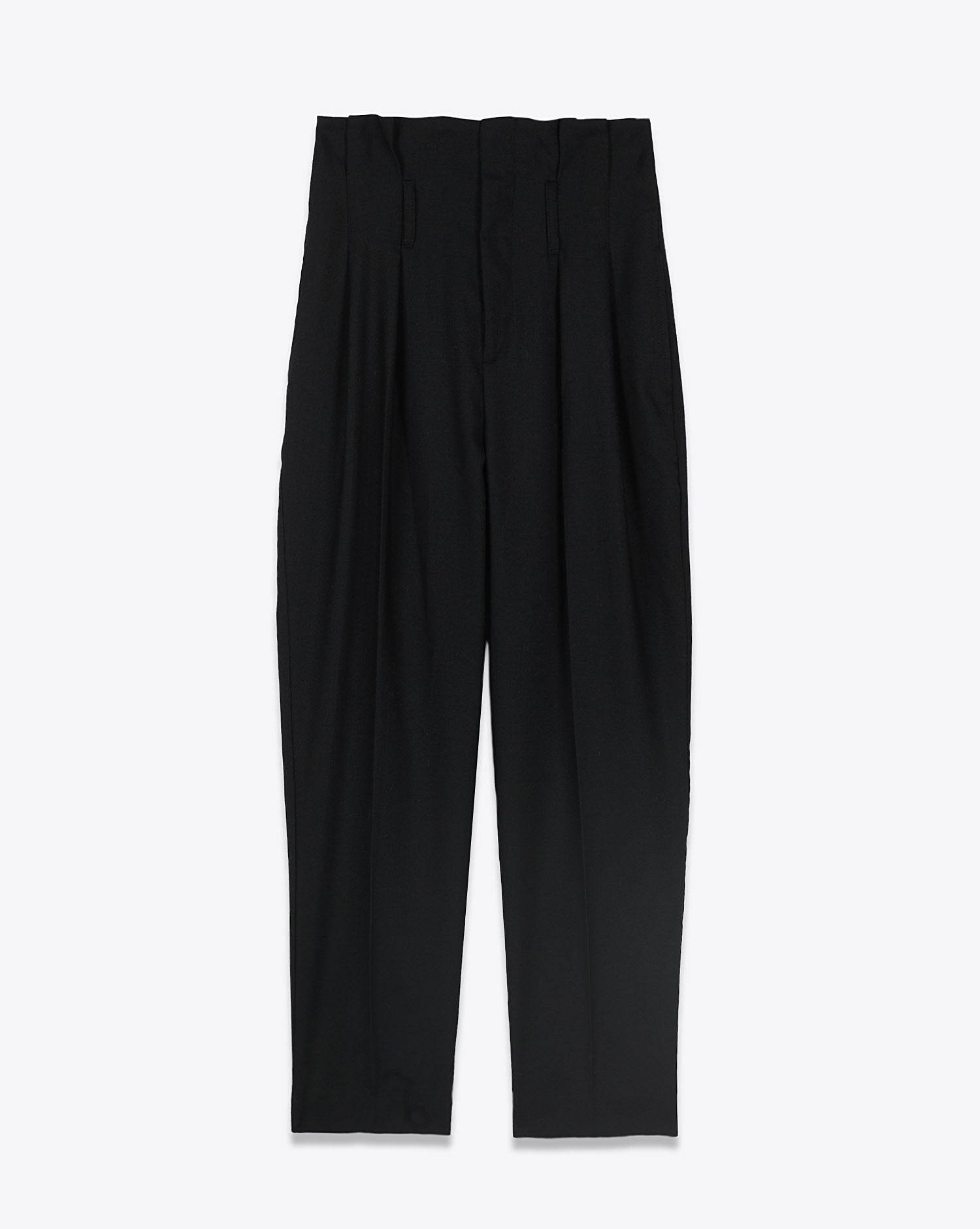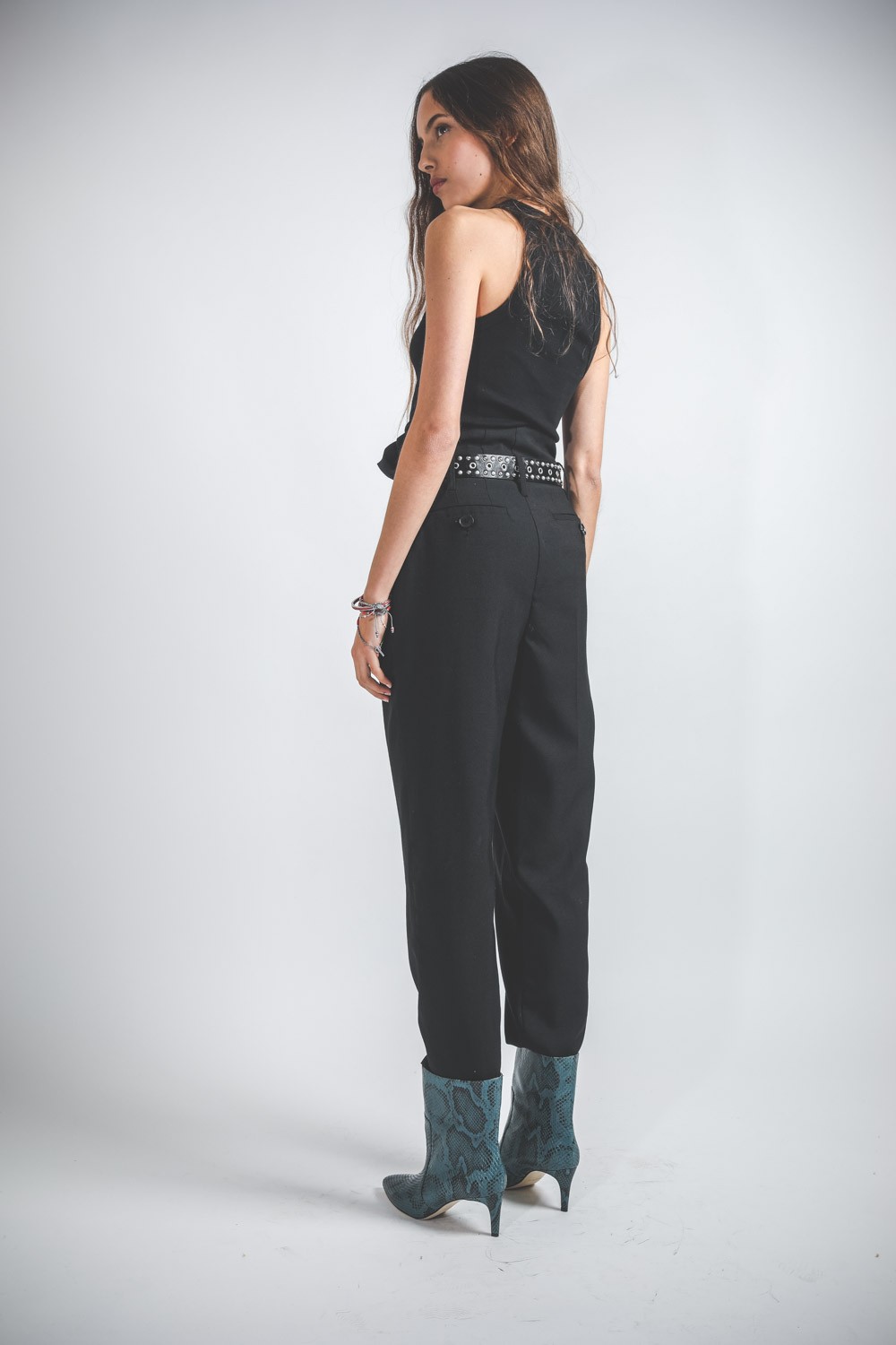- High waist pants - Narrow and streamlined cut - Two pliers - Two pockets in the ribbed seams - Five belt loops at the waist - Two piped pockets on the back - Zip closure - Black woven fabric - Composition: 55% polyester - 45% wool - Dry cleaning only