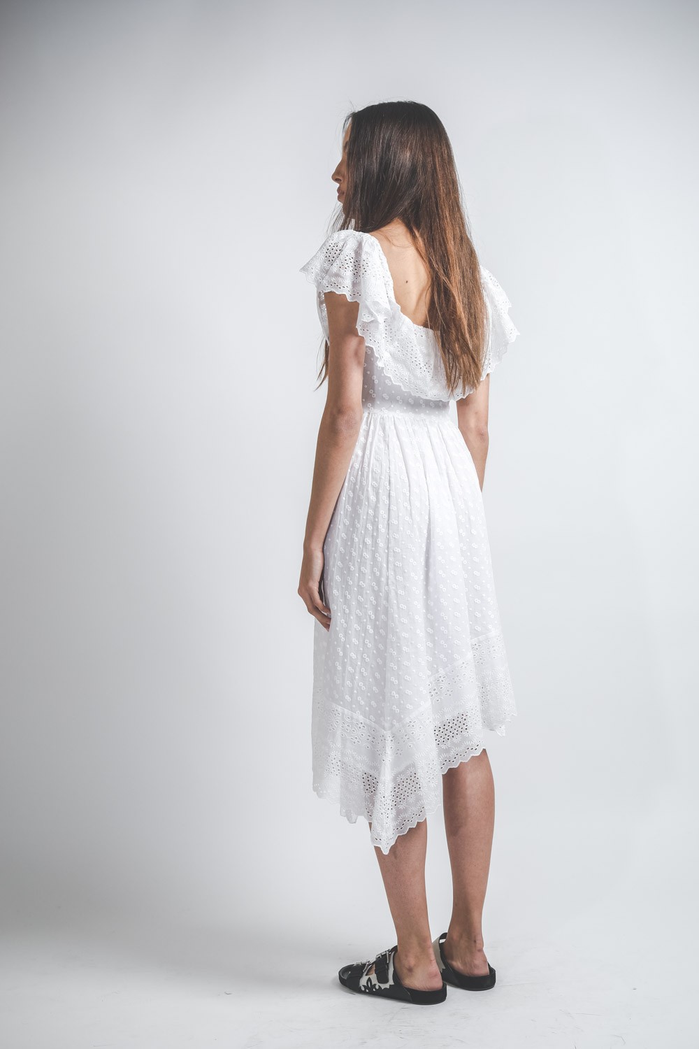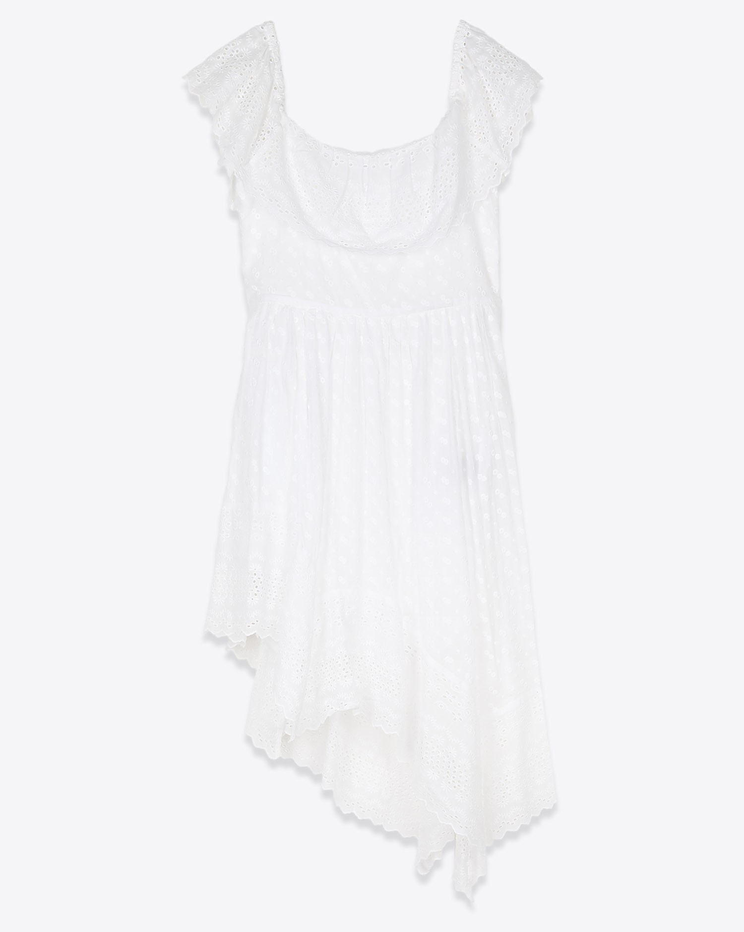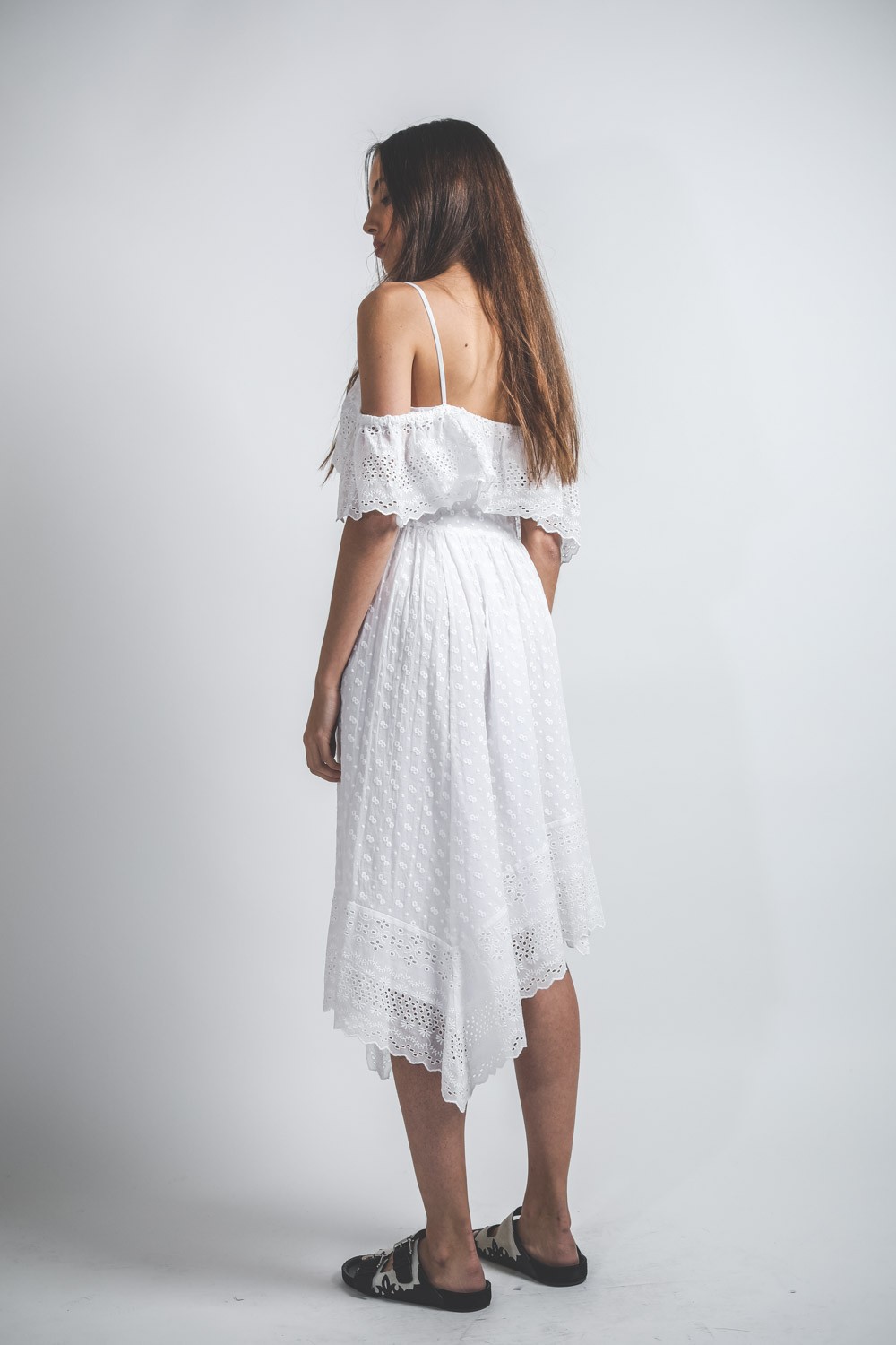 - Asymmetrical dress under the knee - Elastic ruffle neckline + two thin straps - Worn over a drooping shoulder or round neckline - Fitted bust and marked waist - Bottom of dress flared asymmetrical - Invisible zip closure on the side - Embroidered fabric tone on tone white - Lace details - Fully lined - Composition: 100% cotton