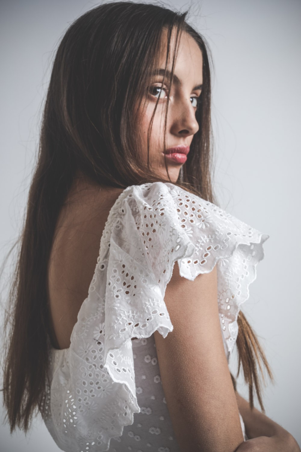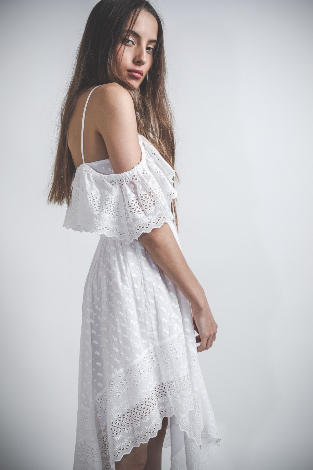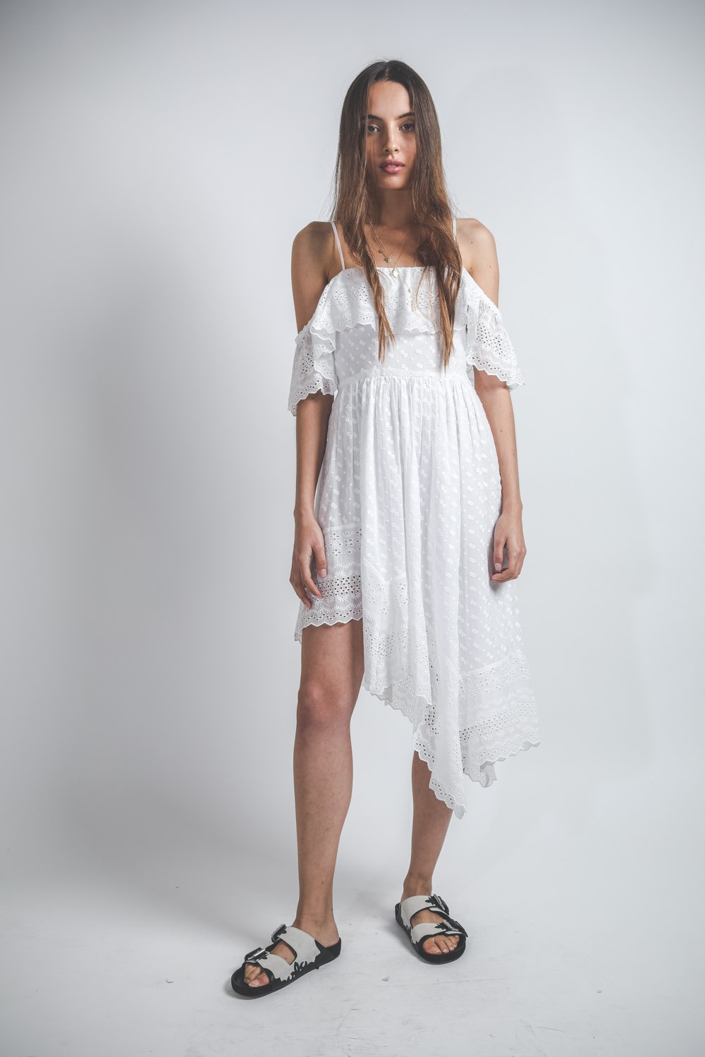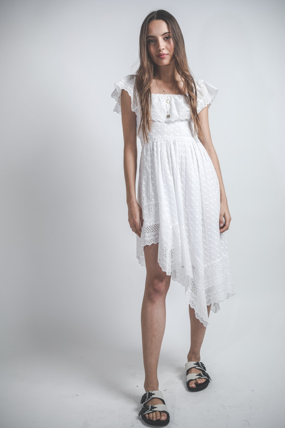 - Asymmetrical dress under the knee - Elastic ruffle neckline + two thin straps - Worn over a drooping shoulder or round neckline - Fitted bust and marked waist - Bottom of dress flared asymmetrical - Invisible zip closure on the side - Embroidered fabric tone on tone white - Lace details - Fully lined - Composition: 100% cotton