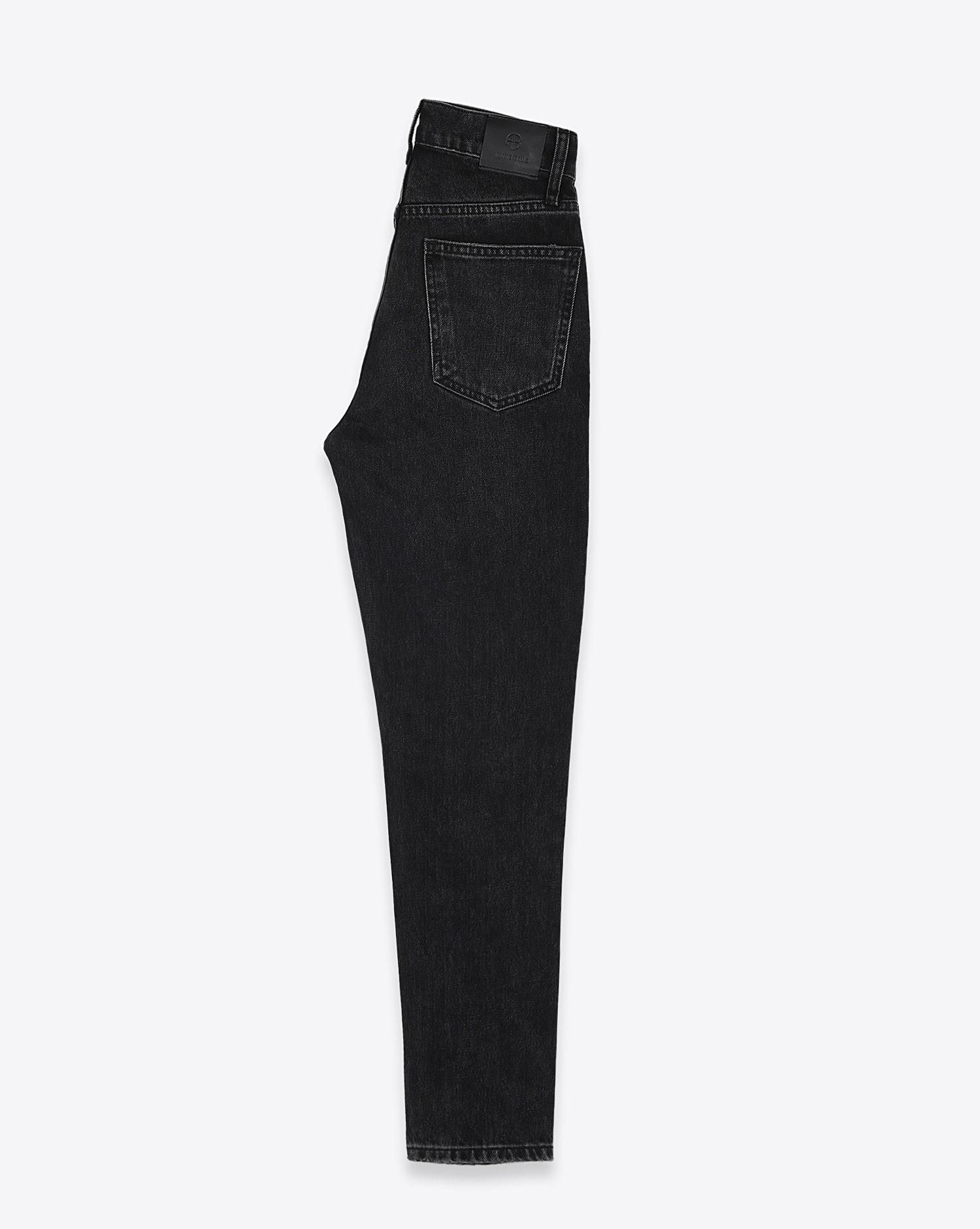 - Jeans 5 pockets high waist slim fit - Belt with multiple loops - Closing with an engraved button and a fly hidden under flap - Silver rivets and leather label embossed with logo sewn on the back belt - Two front pockets + one ticket pocket - Two back patch pockets - Black Charcoal Washing - Rigid canvas vintage spirit - Composition 100% cotton