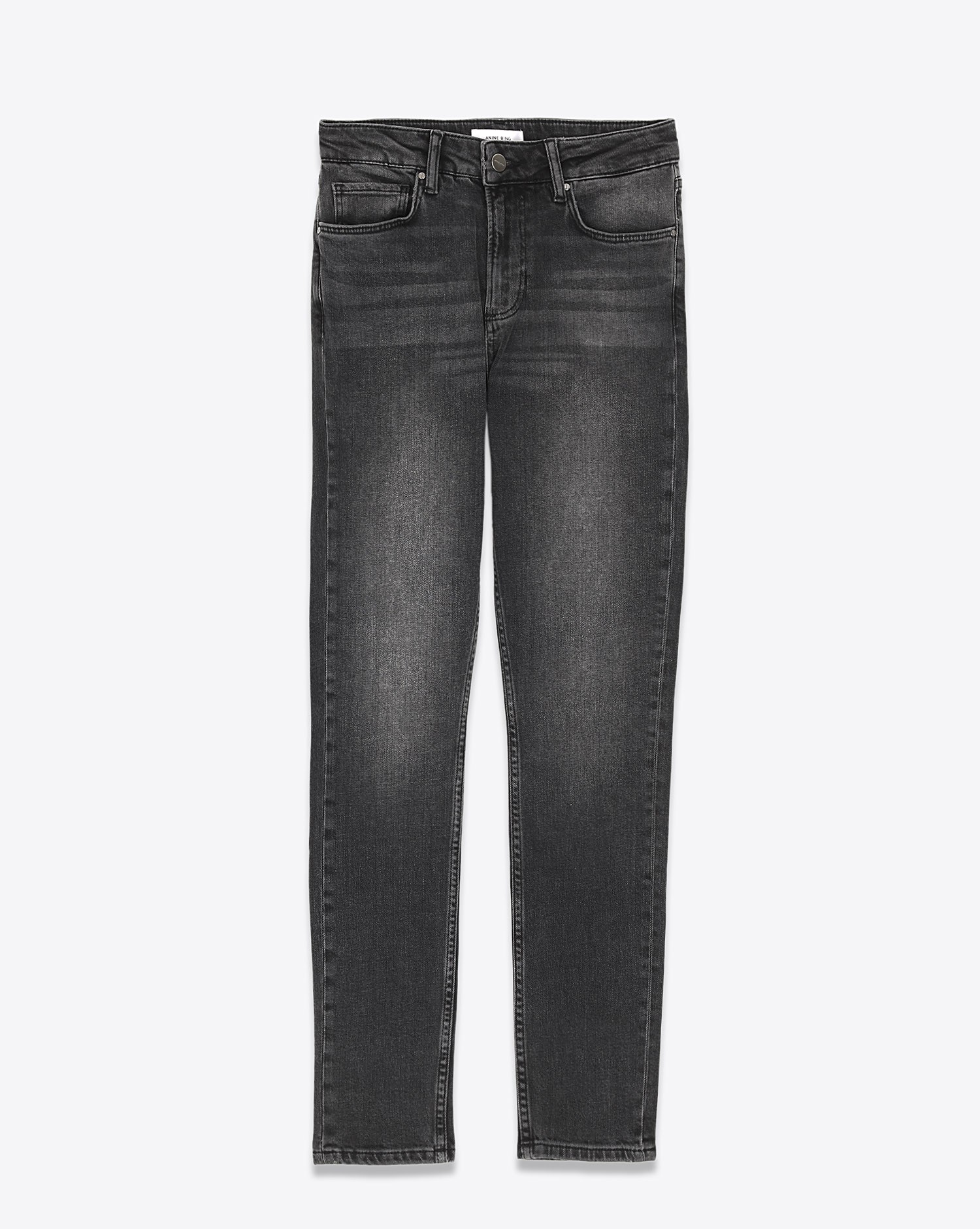 - High waist jeans - 5 loop waistband - One button and zip closure - Five pockets - Black leather "Anine Bing" jacron sewn to the waistband at the back - Skinny fit - Faded fabric - Composition: 97% Cotton 3% Elastane