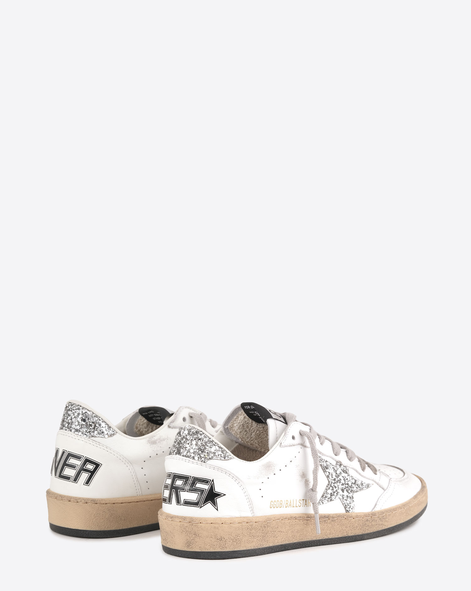 Golden Goose Ball Star trainers in white leather with a silver glitter star and back