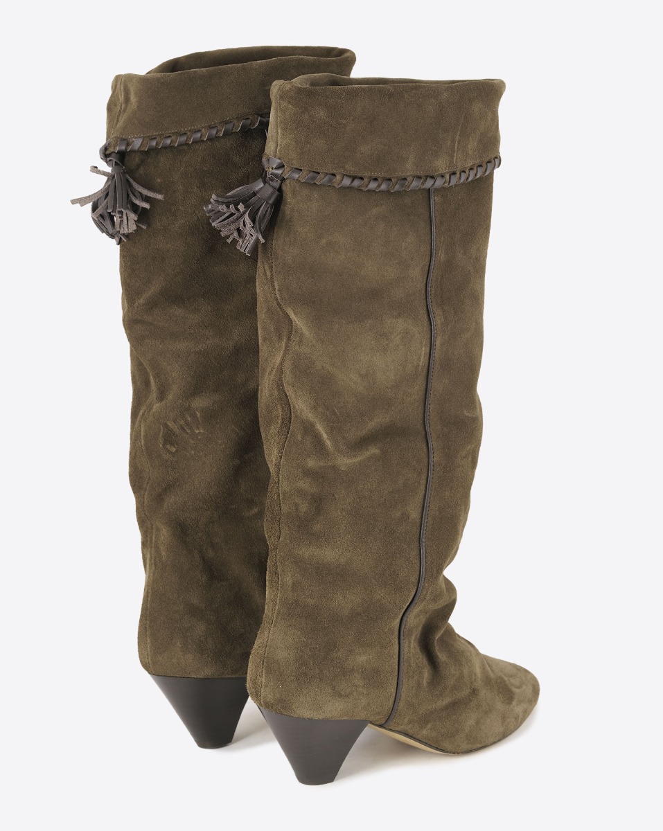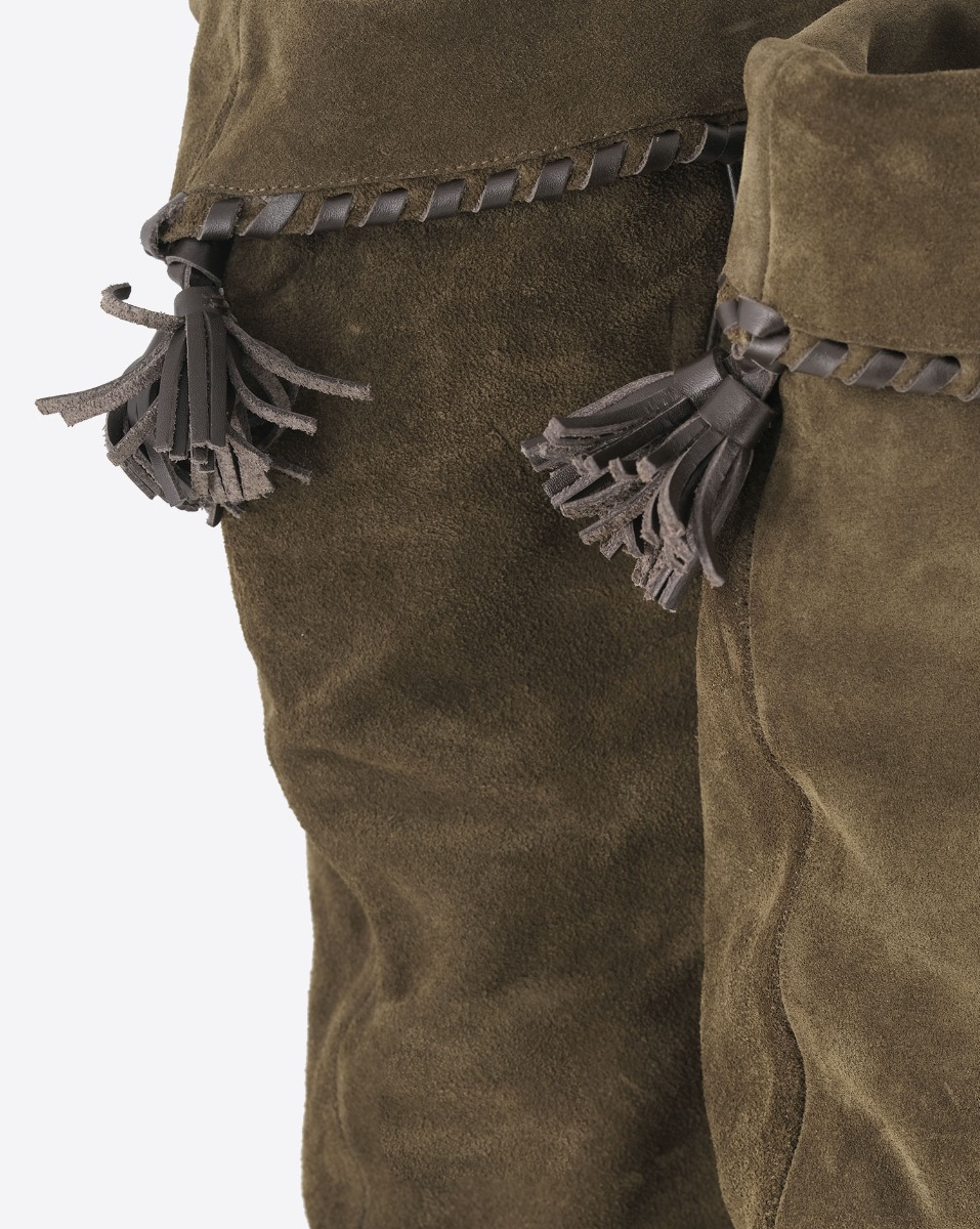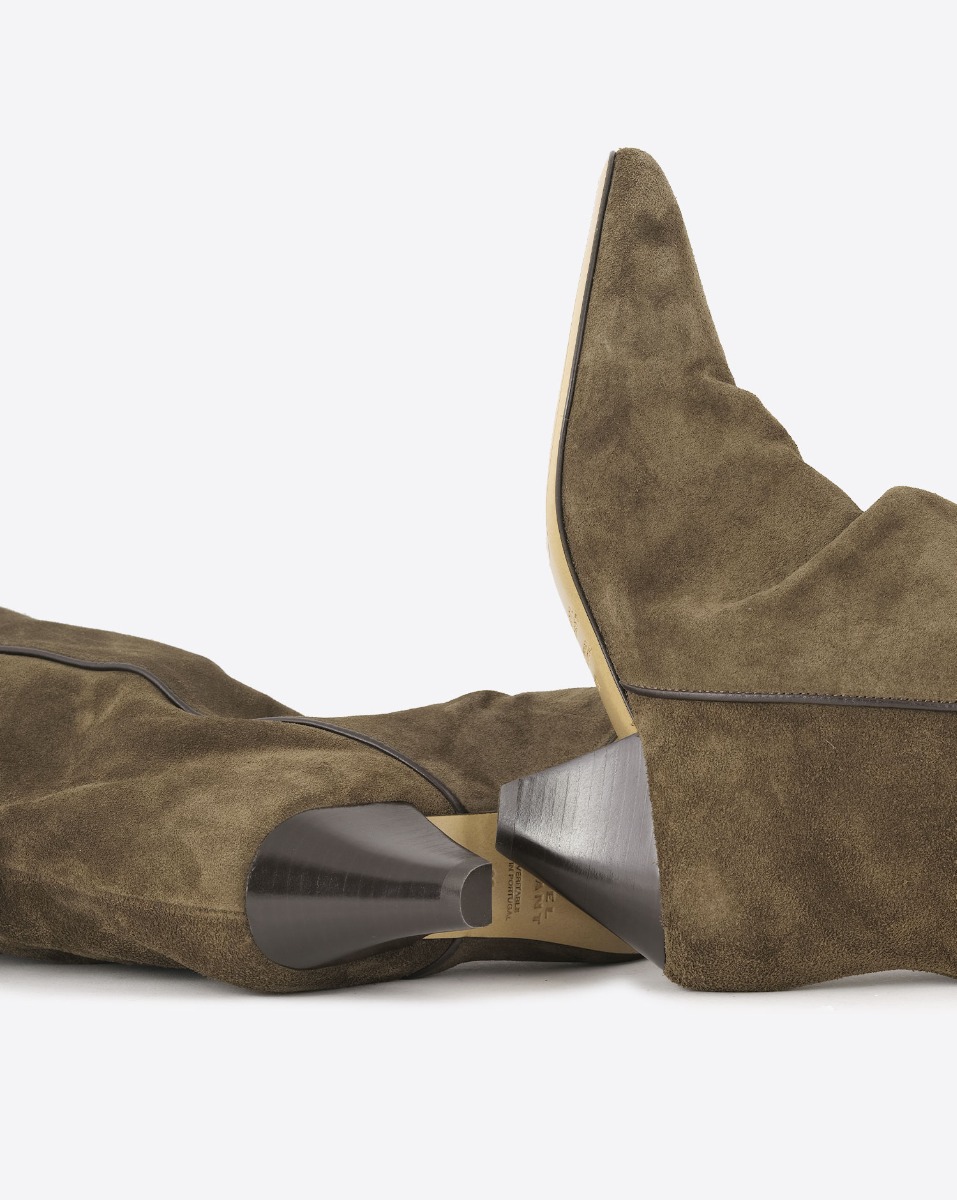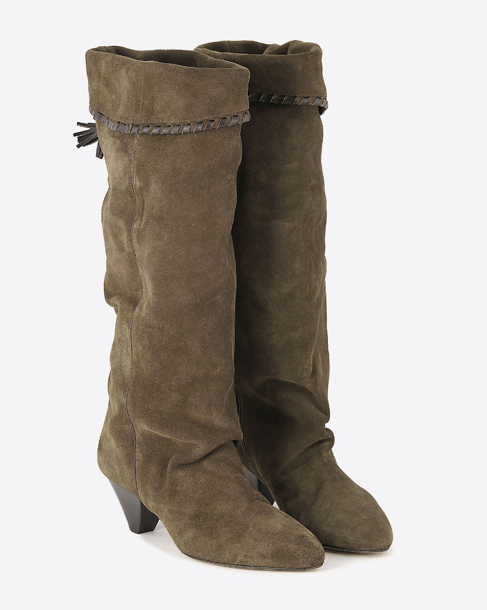 The Elita boots by Isabel Marant in bronze suede are a standout piece in any winter wardrobe. Worn bare-legged with tailored shorts, an Irish-style chunky knit sweater, and a shearling-inspired coat, they perfectly capture Isabel Marant’s signature blend of effortless elegance and bohemian spirit. This look, featured in the Winter 2025 editorial, plays on warm textures and structured silhouettes for a bold, modern attitude.