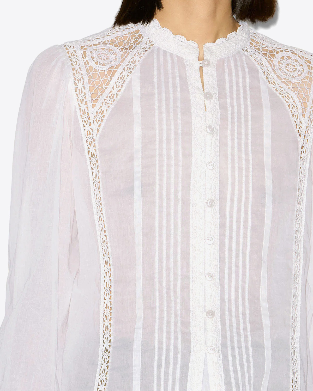 The Greicy blouse by Isabel Marant Étoile blends timeless elegance with contemporary ease. Made from lightweight organic cotton voile, it features lace inserts, delicate cuffs, and a refined neckline, all in a subtly sheer finish.