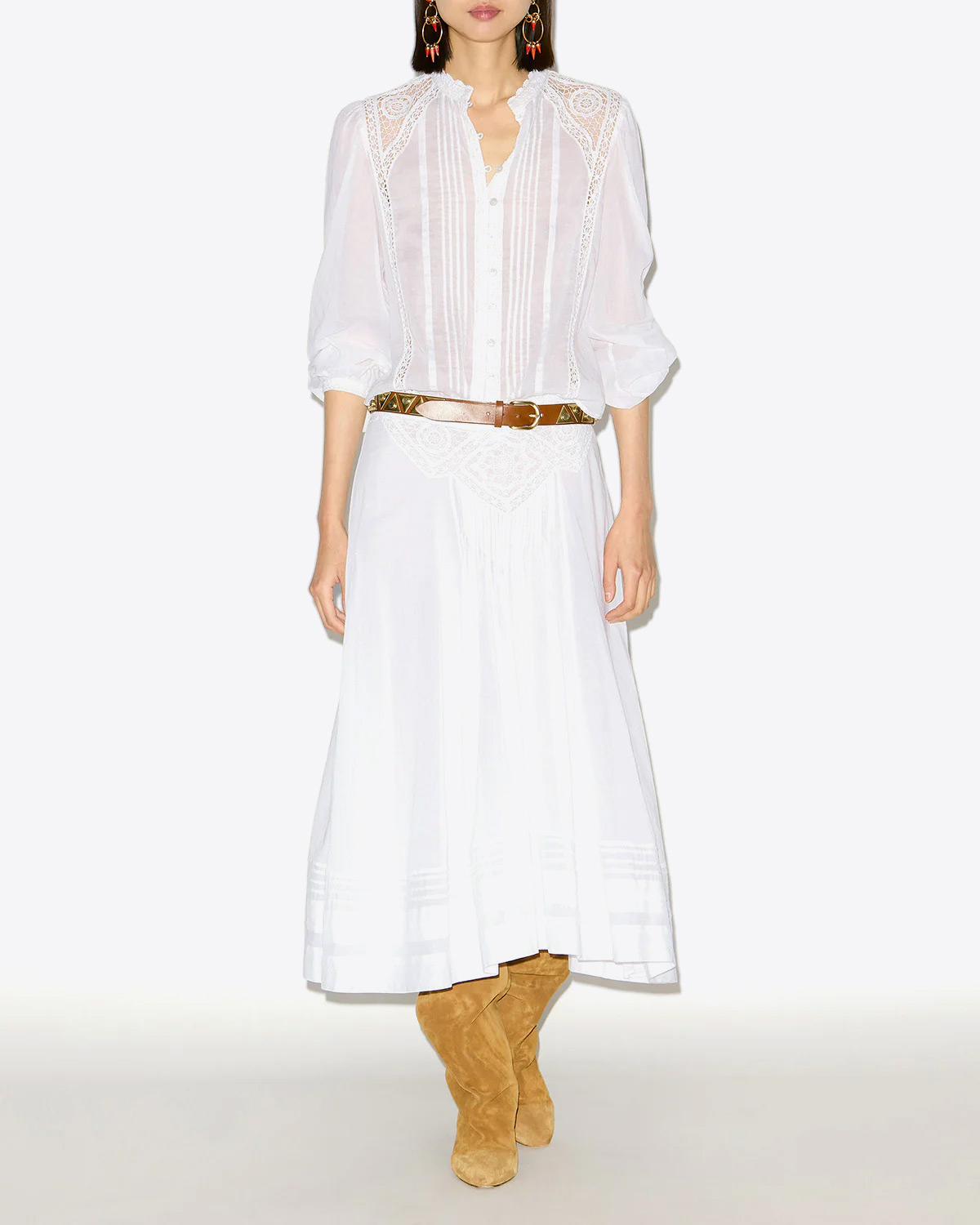Its straight cut makes it easy to style tucked into high-rise denim or left loose over a flowing skirt. The lace details at the shoulders and sleeves give it that signature Marant poetic flair.