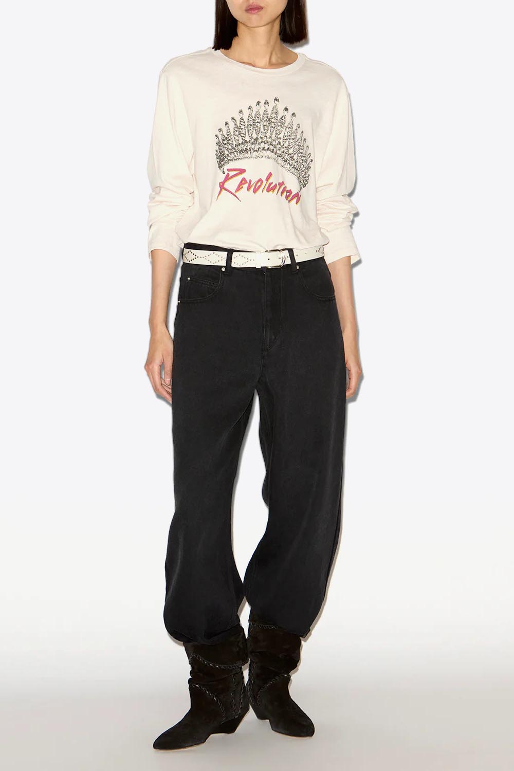 A standout piece from Isabel Marant Étoile’s Winter 2025 collection, the Martine tee blends softness and statement. Crafted in organic cream cotton, it features long sleeves and a relaxed fit, topped with a bold red “Révolution” print and a graphic tiare. Wear it under a leather jacket or oversized coat, or style it simply with wide-leg jeans. A manifesto tee, made to express both attitude and effortless style.