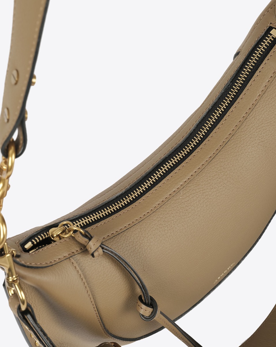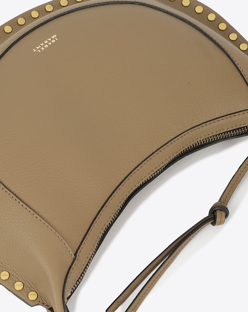 - Shoulder bag - Hand, shoulder, or cross-body carry - Short leather handle for hand-carrying - Adjustable long leather shoulder strap for carrying over the shoulder or cross-body - Removable handle and shoulder strap with engraved gold metal snap hooks - Zip fastening with long knotted leather slider - Gold stud detail all around the bag - Small patch pocket inside - Isabel Marant" logo embossed on front - Composition: 100% cowhide leather - Lining: 60% polyamide - 40% polyurethane