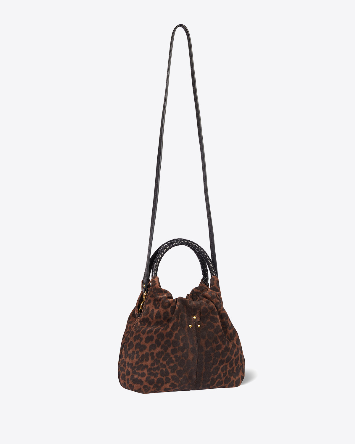 The Gordi S bag by Jérôme Dreyfuss makes a bold statement in a compact silhouette. With its round mini shape, structured braided leather handles, and natural leopard suede, it’s the ultimate mix of wild and elegant.