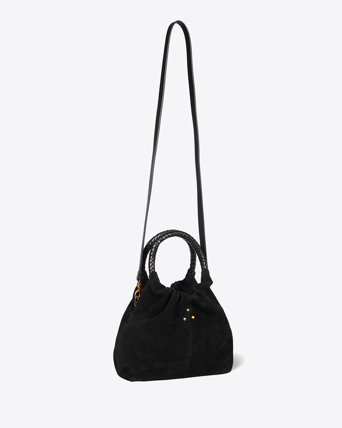 The Gordi S bag by Jérôme Dreyfuss appears here in a timeless and sophisticated black suede leather version. This mini bag, shaped like a soft round pouch, features signature gold-tone detailing for a touch of elegance.