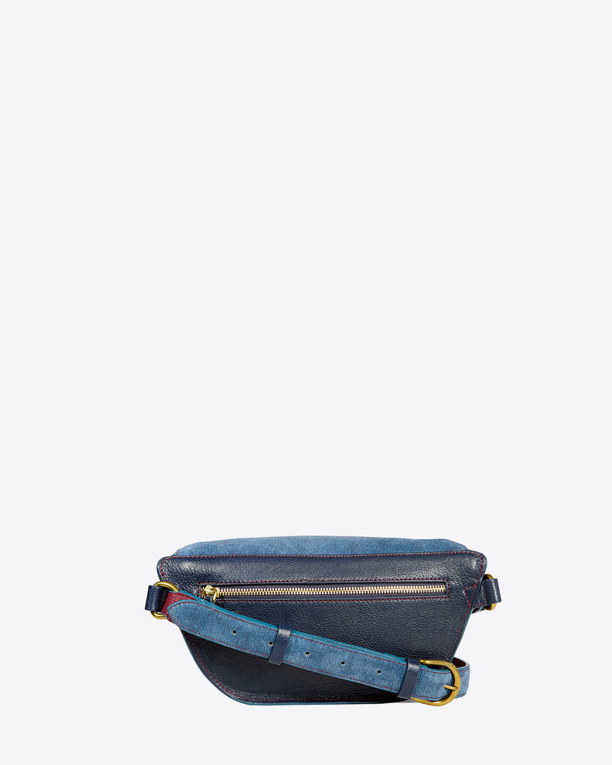 The Lino belt bag by Jérôme Dreyfuss reinvents the classic with its rare blue suede leather that perfectly mimics denim fabric. Versatile, it can be worn at the waist or crossbody for a casual yet chic look.