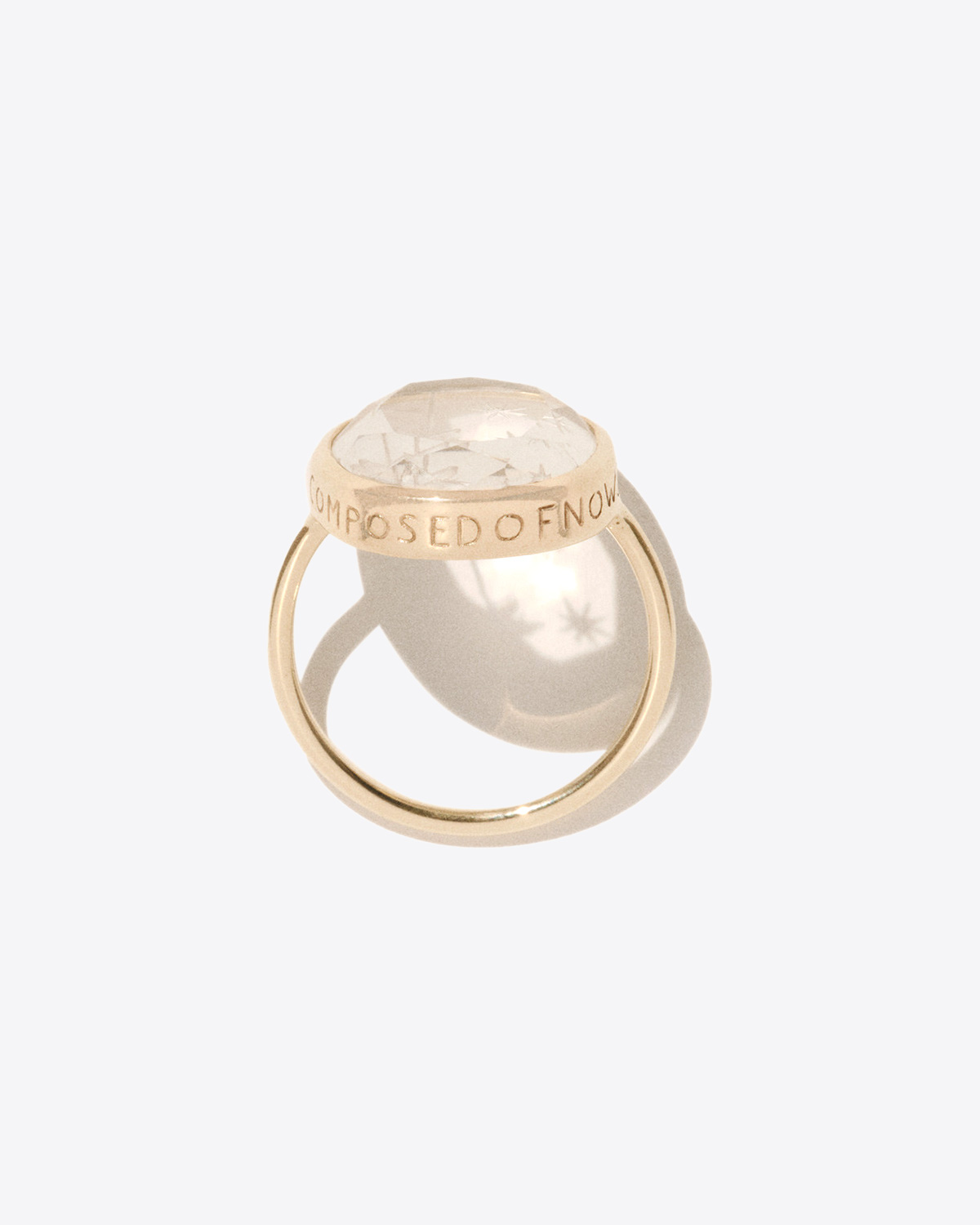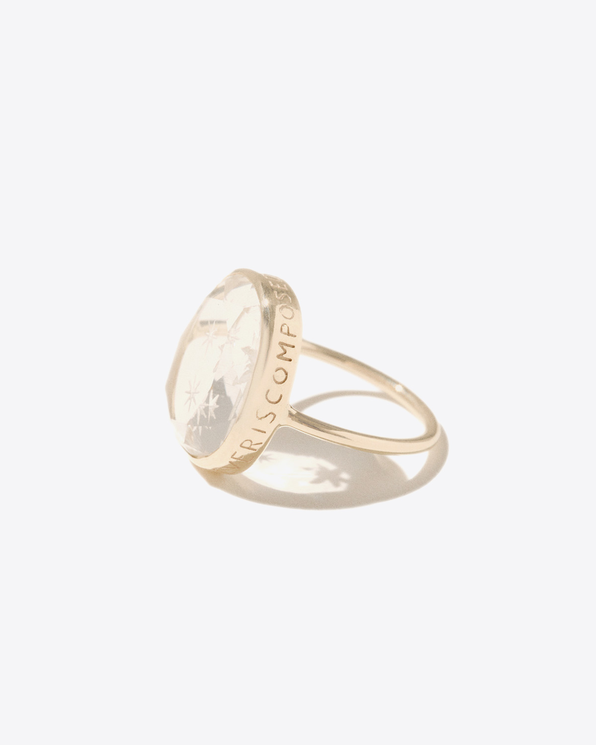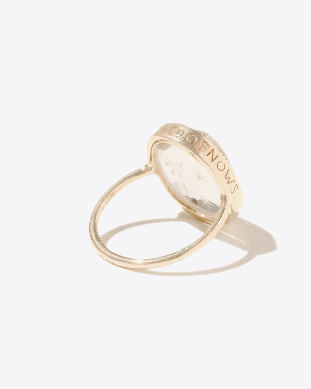 - Ring - A rock crystal stone with a hand-engraved palm tree - Setting engraved ‘Forever is composed of nows’. - Composition: 9 carat yellow gold