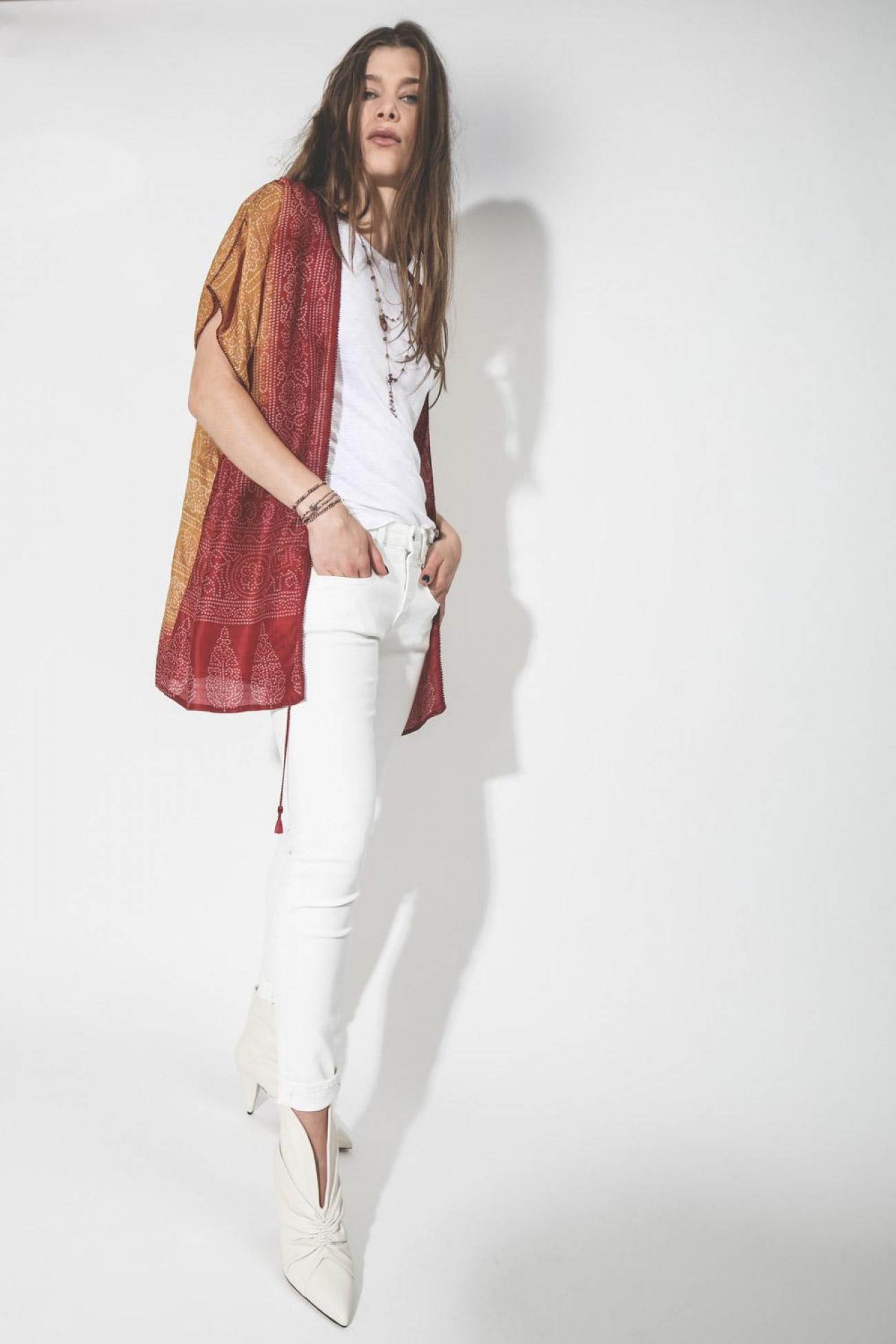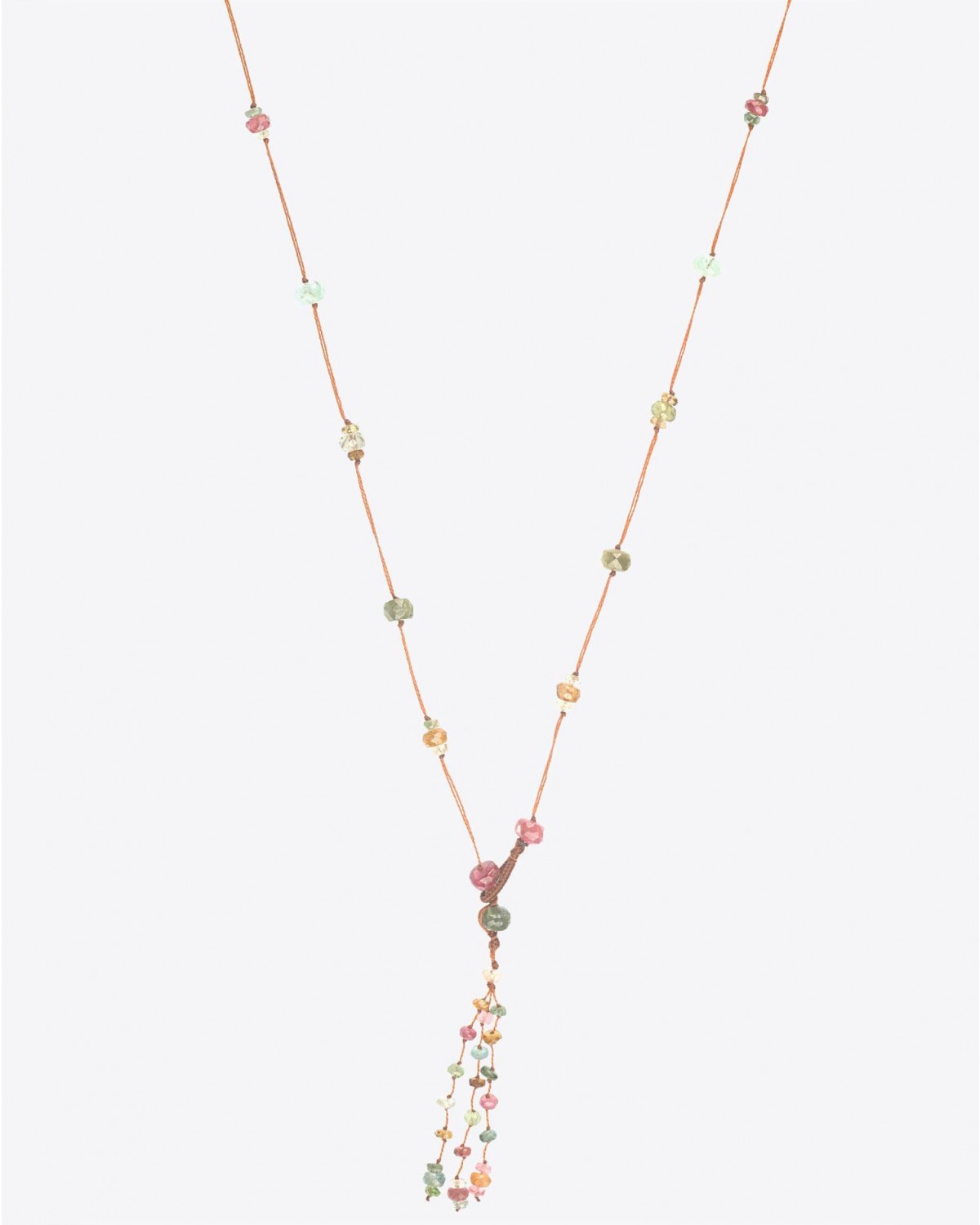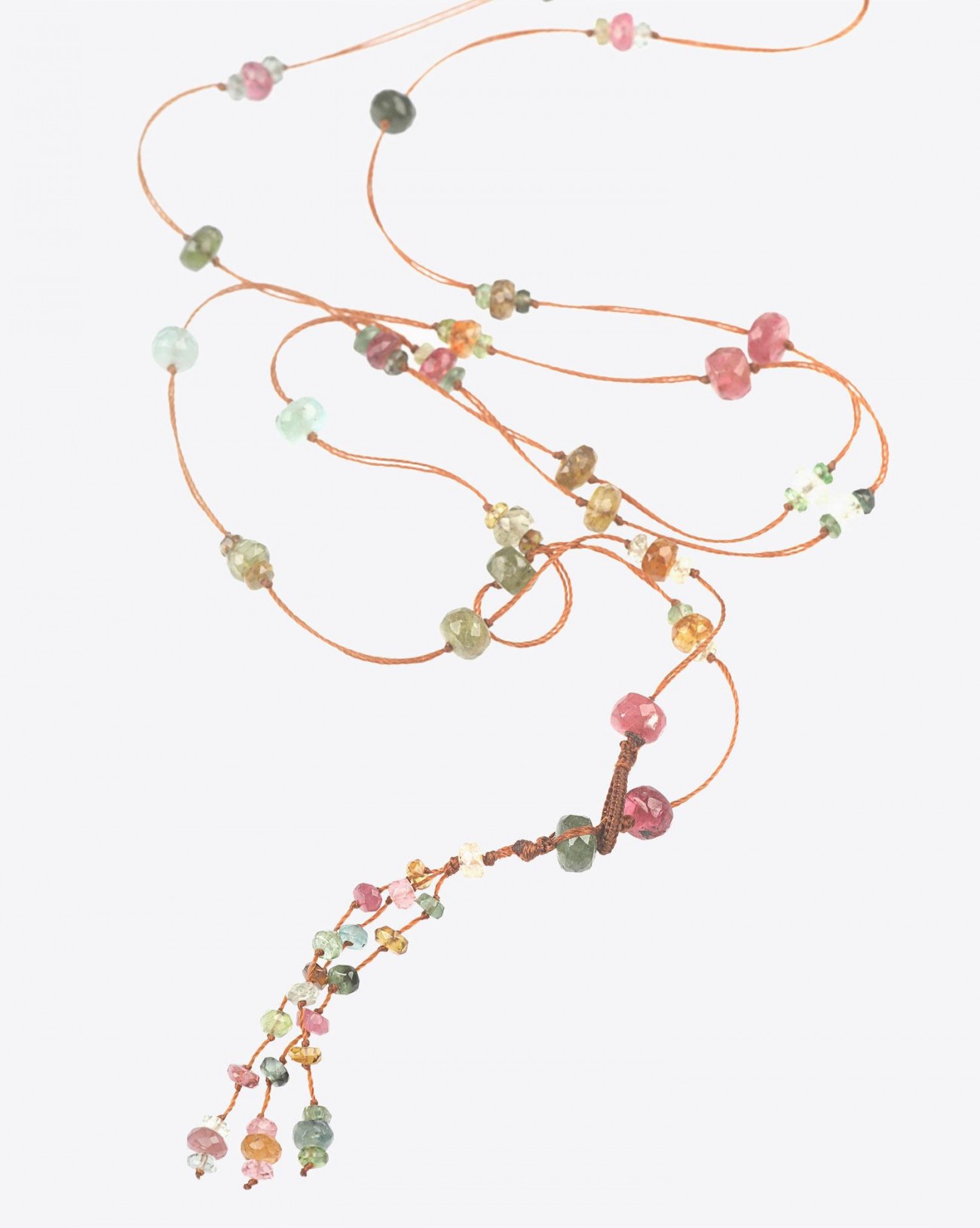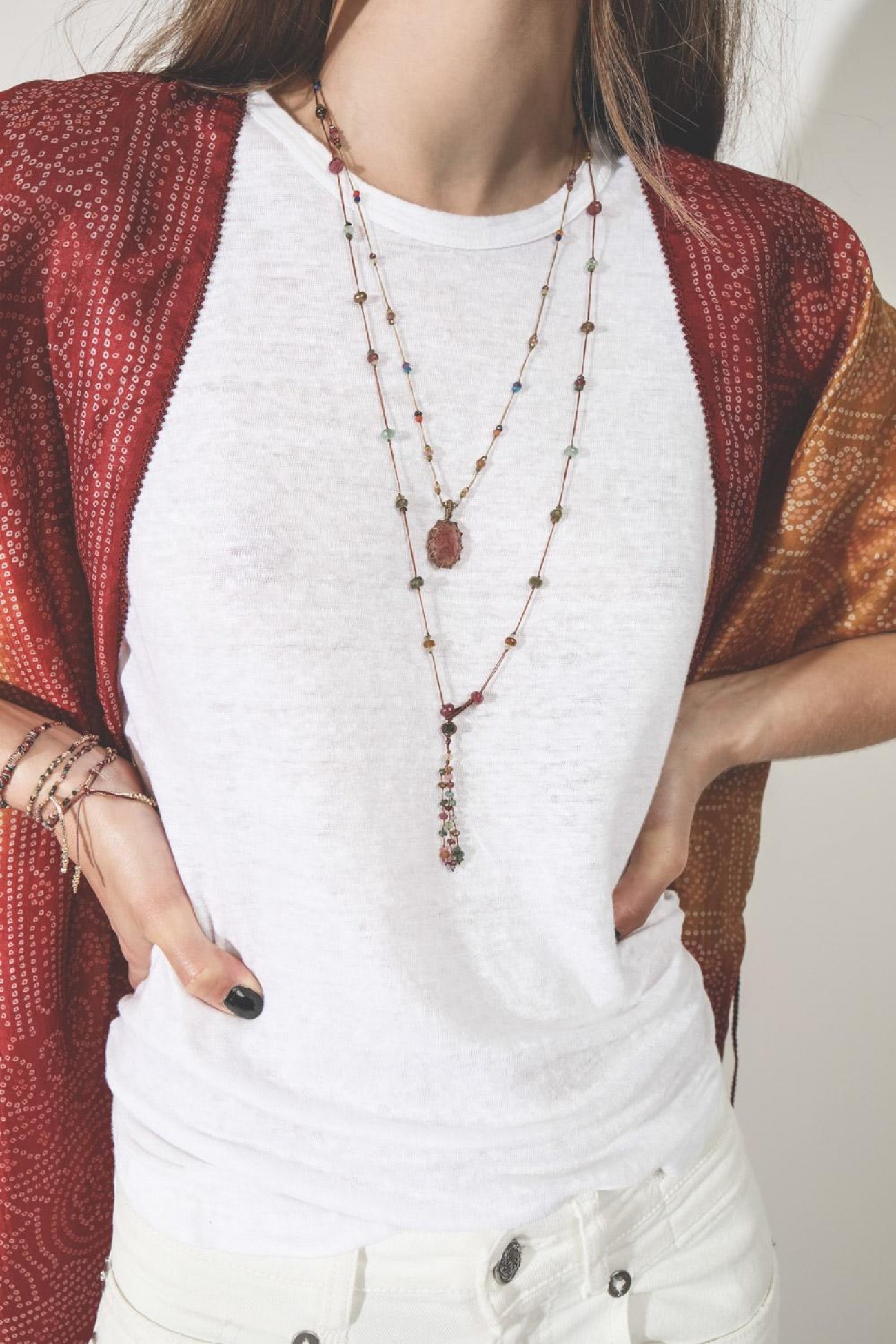 Fall for the Pampille Holy Tourmaline long necklace from the Sharing brand, bright thanks to the combination of its multicolored tourmaline pearls and its tobacco-colored cord! Is your wardrobe halfway between rock and bohemian? Wear it with a white t-shirt and low-rise jeans, and pair it with Isabel Marant's Lasteen boots for the rock bail and the 1235 kimono in an old sari from designer Hand.So.On for the bohemian touch. A mixture of contemporary and original genres.
