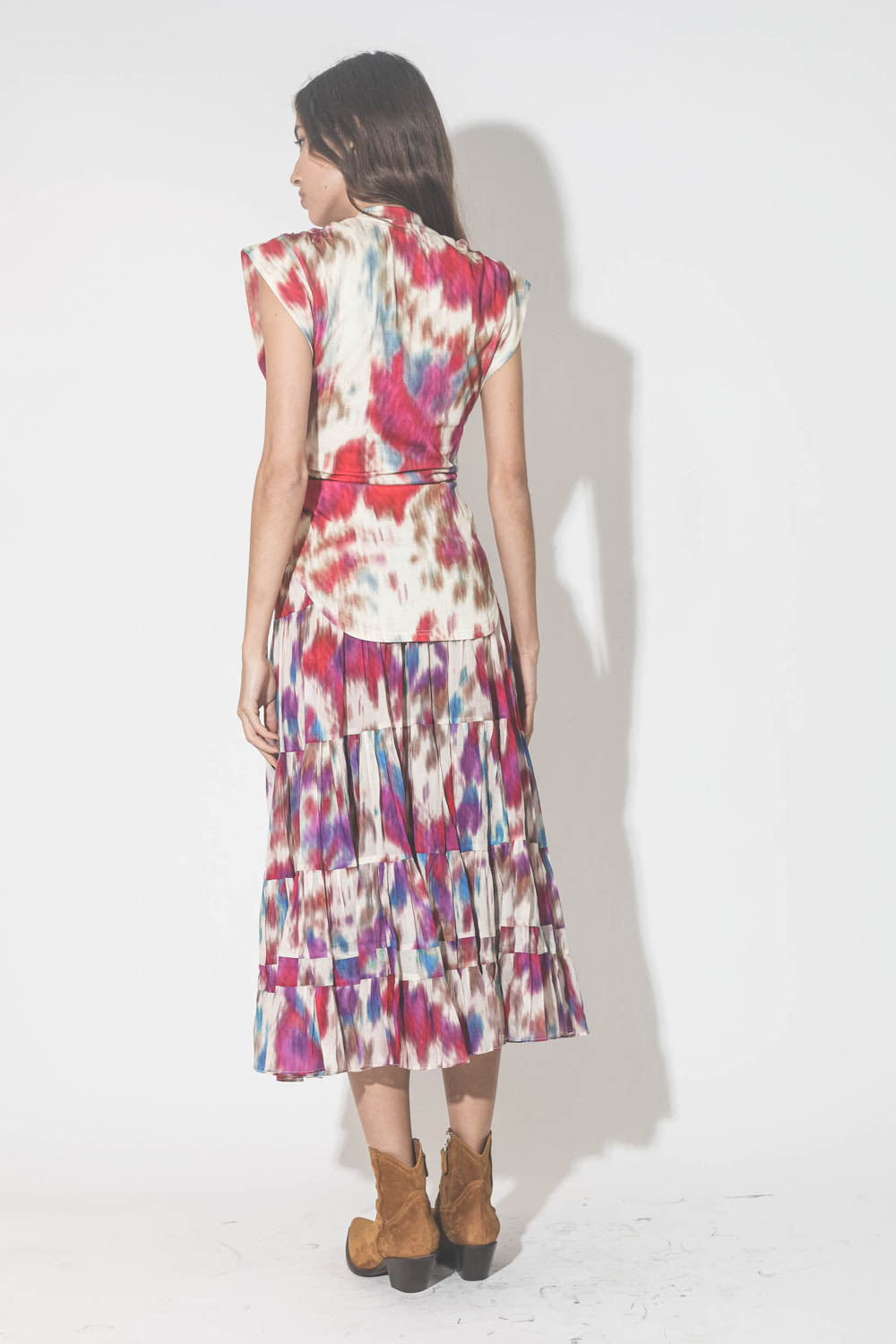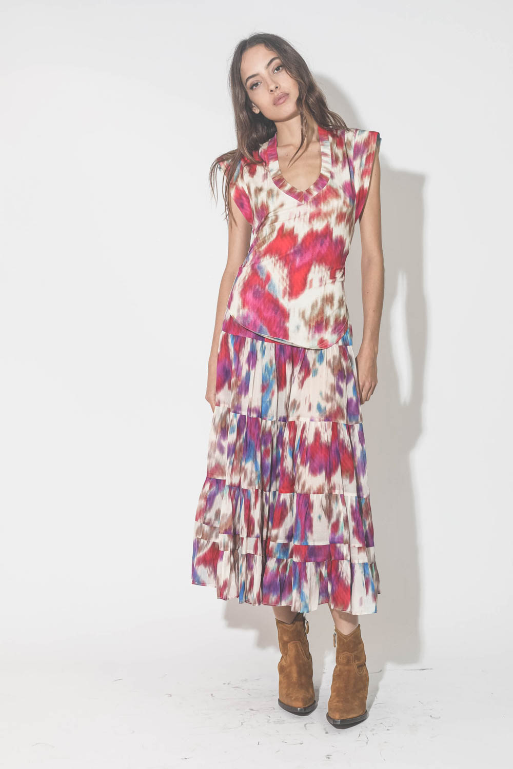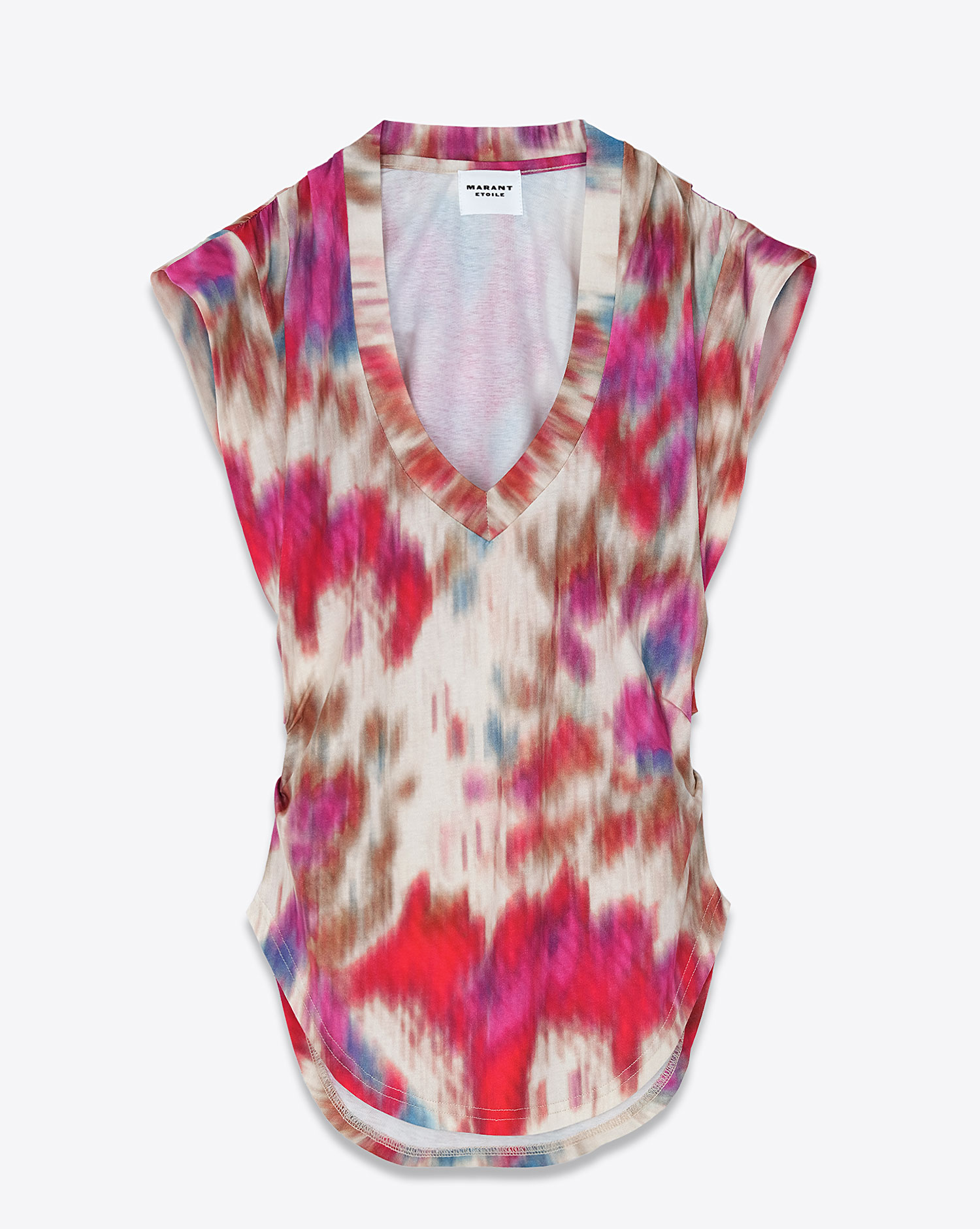 C'est le grand retour des t-shirts col V ! Longtemps rangés au fond de notre armoire, ils opèrent un retour en force sur le devant de la scène fashion et on adore ce come back ! Faites un accueil fracassant au t-shirt Zilen signé Isabel Marant Etoile.Son imprimé tie and dye revisité dans des tonalités roses et beiges fleurent bon le soleil et la bonne humeur. À porter sans modération avec ses basiques préférés ou la jupe coordonnée, disponible sur La Grande Boutique.