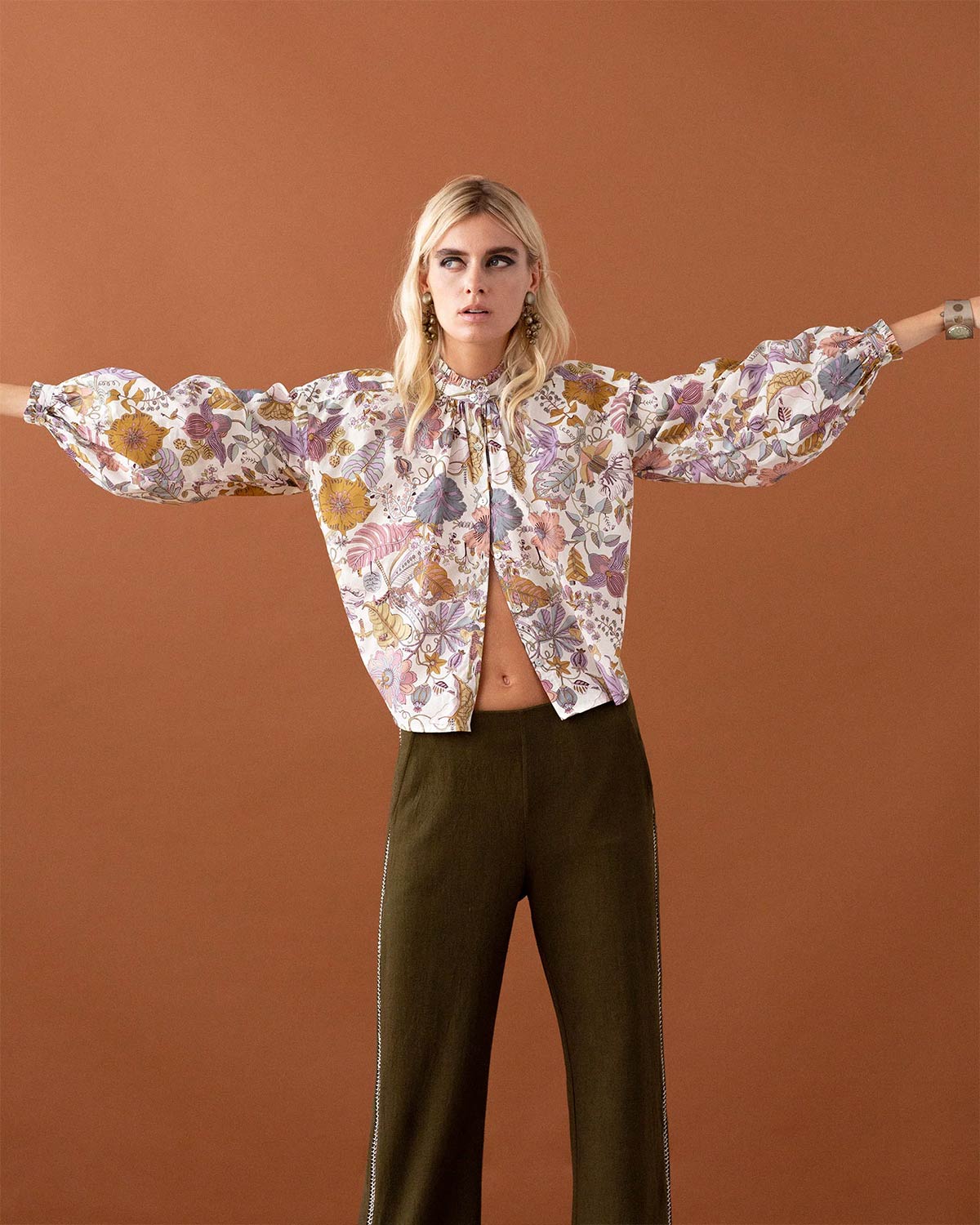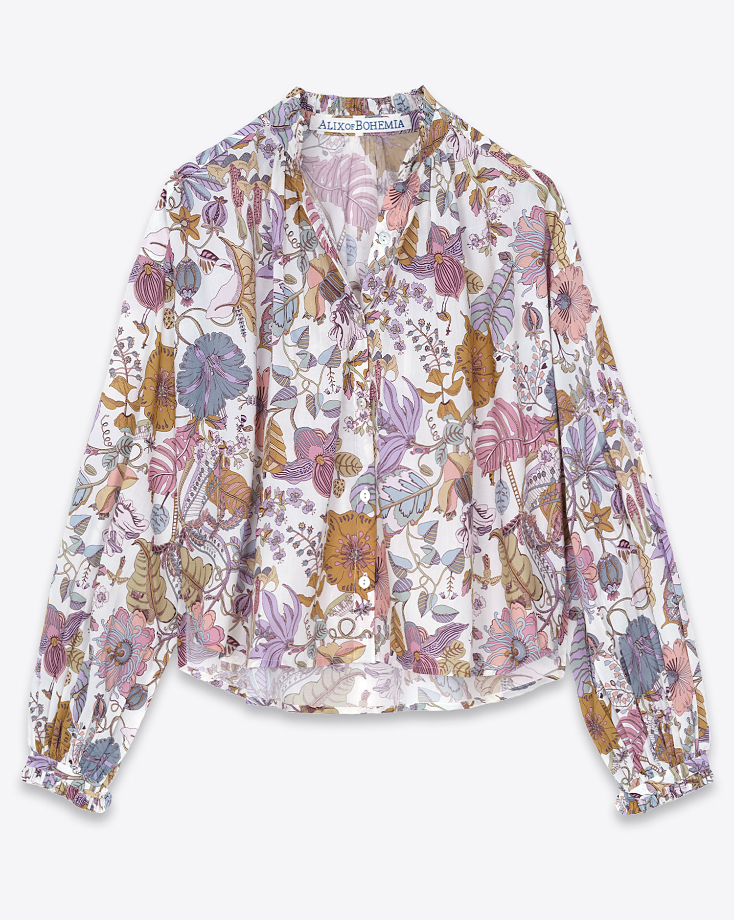 - Chemise manches longues froncées - Col montant - Fermeture boutonnée - Motif floral - Imprimée à la main - Base arrondie - Composition: 100% coton
