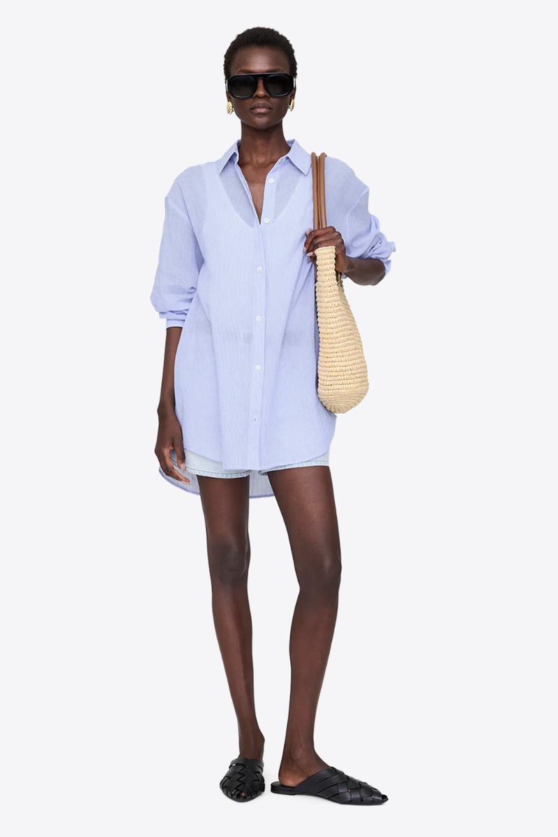 La chemise Plaza signée Anine Bing s’impose comme l’essentiel tailoring de la saison. Sa coupe oversize au tombé structuré, sa base asymétrique et son motif rayé bleu ciel et blanc insufflent une élégance facile à ce modèle à l'esprit masculin-féminin. En voile de coton, elle combine fraîcheur et structure, parfaite pour les journées lumineuses.