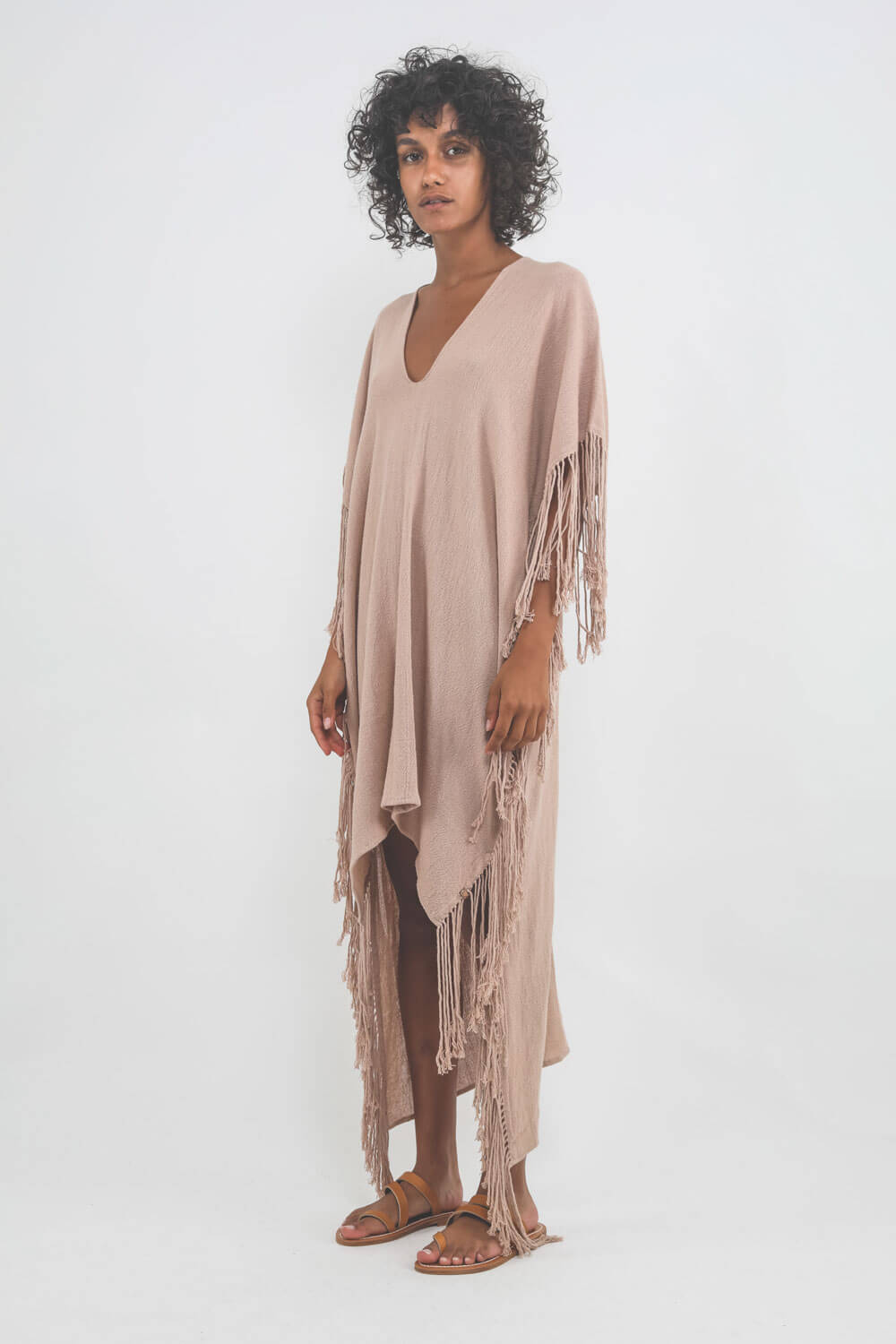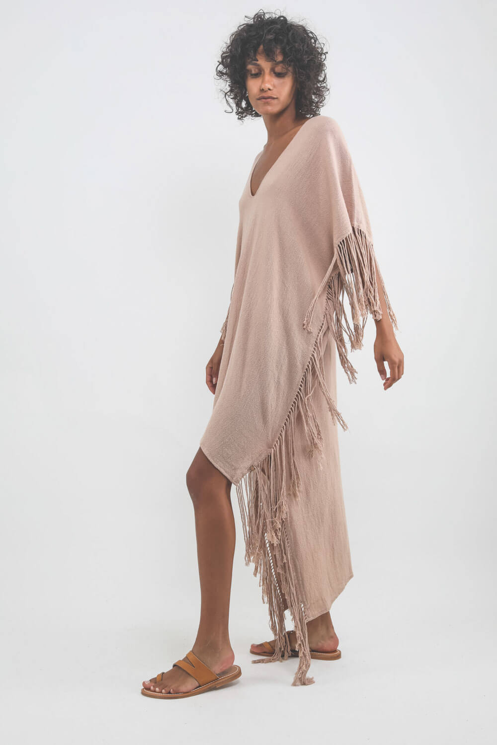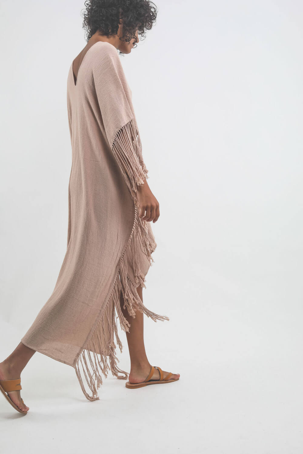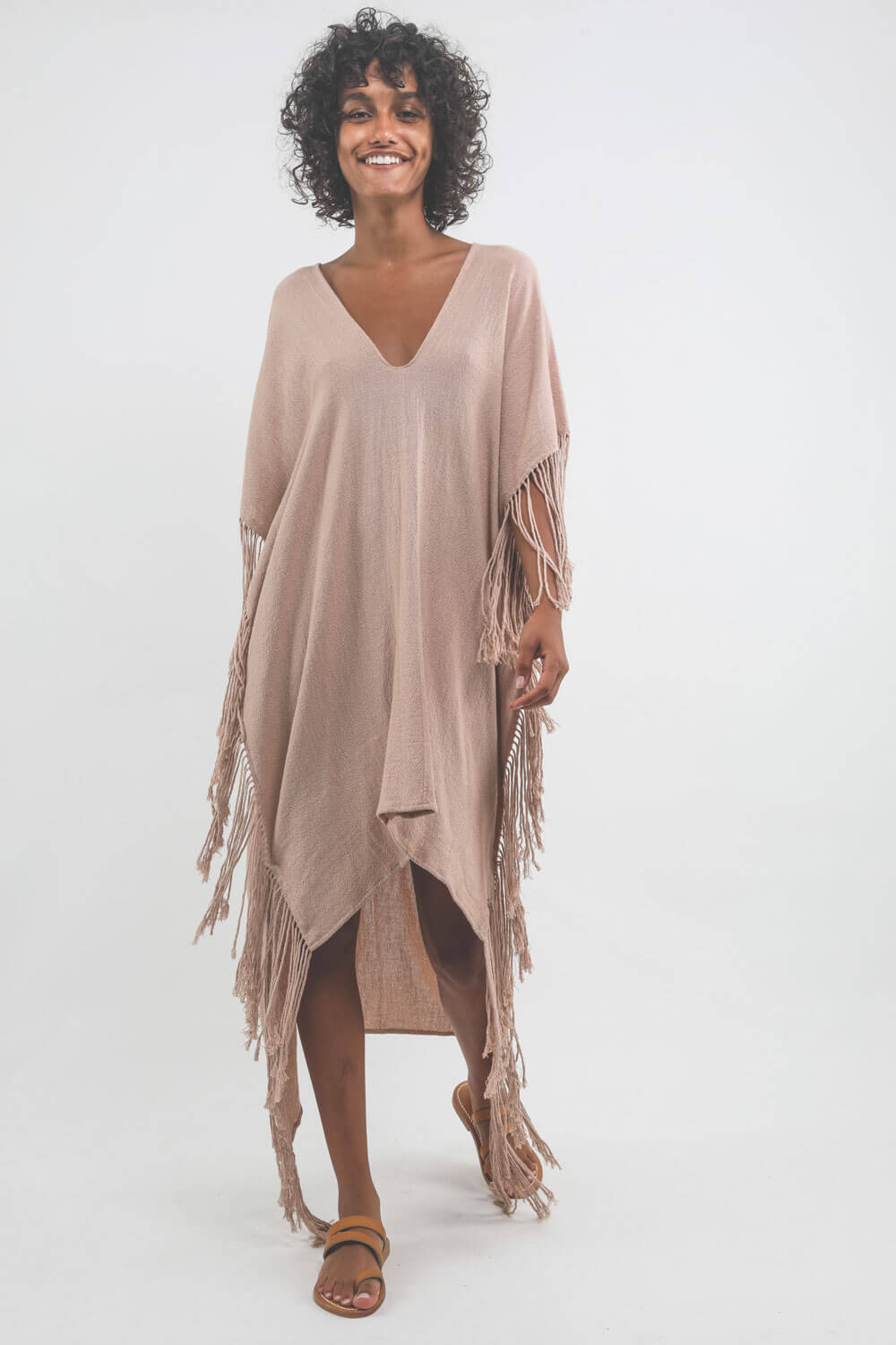 - Robe courte - Manches courtes - Décolleté V - Coupe oversize - Gaze de coton - Détails franges sur les côtés - Plus longue à l'arrière qu'à l'avant - Taille unique - Composition: 100% coton