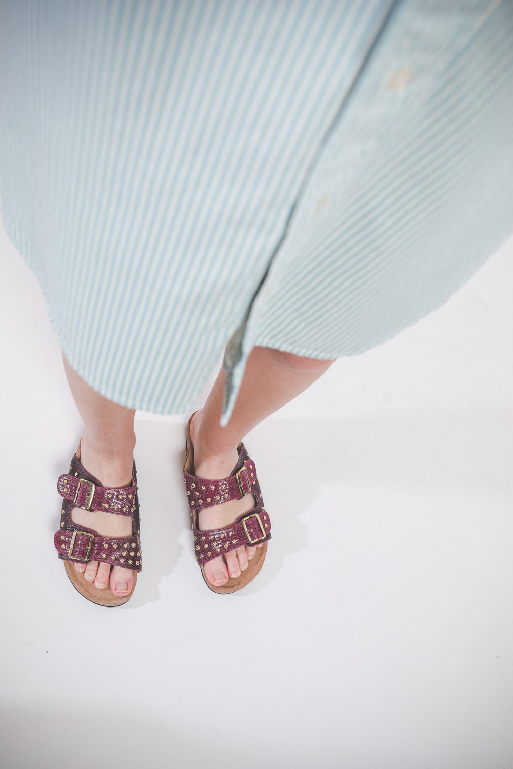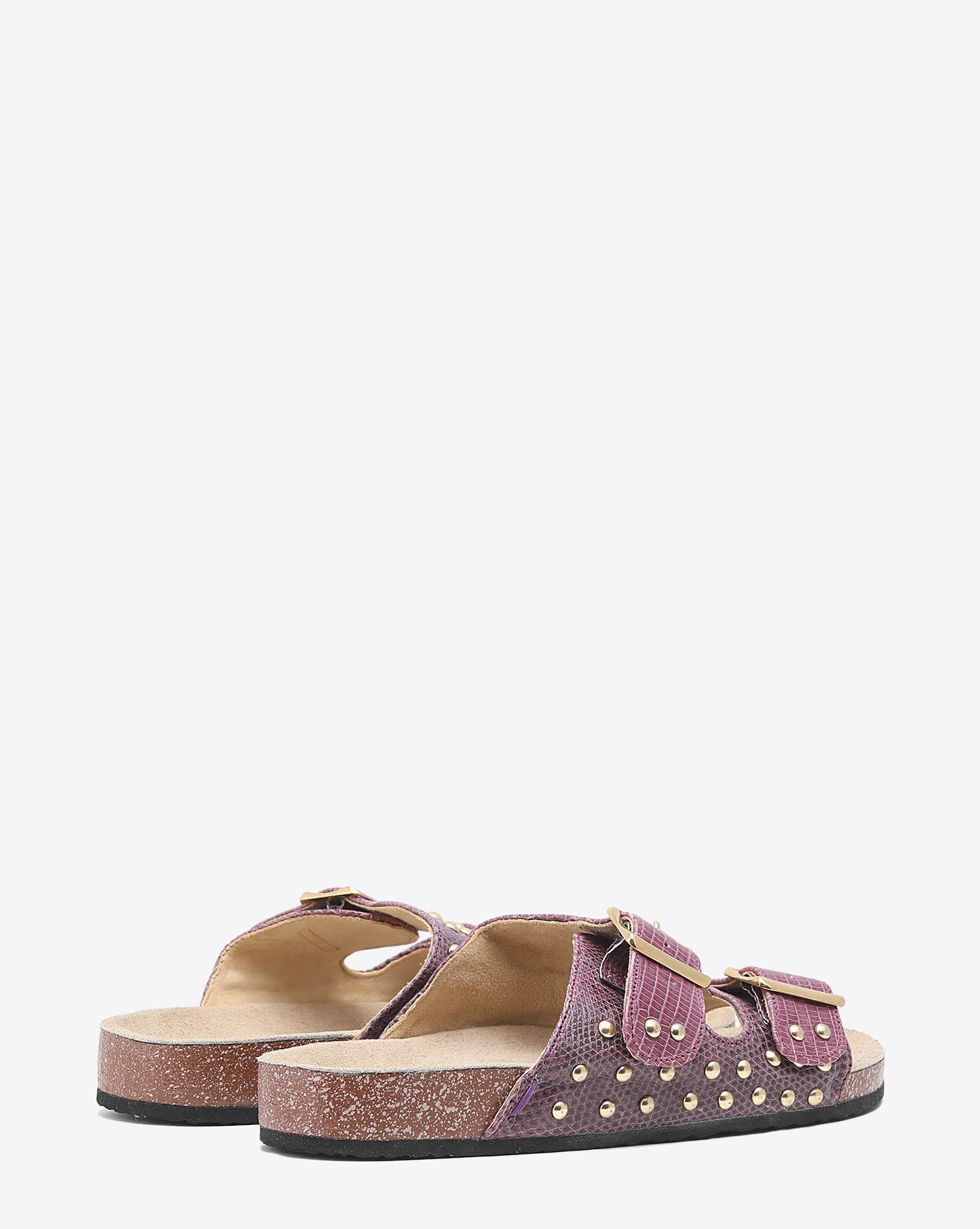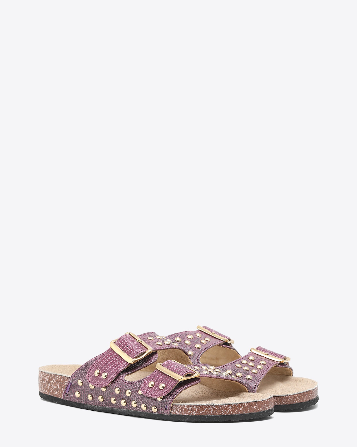 Modèle incontournable de la maison Claris Virot, les sandales Odette se distinguent par leur coupe parfaite et leur look décontracté. Laissez-vous surprendre par cette paire cloutée violette confectionnée à partir de peaux de python. Pour un look 100% casual, on la porte avec une chemise super oversize.