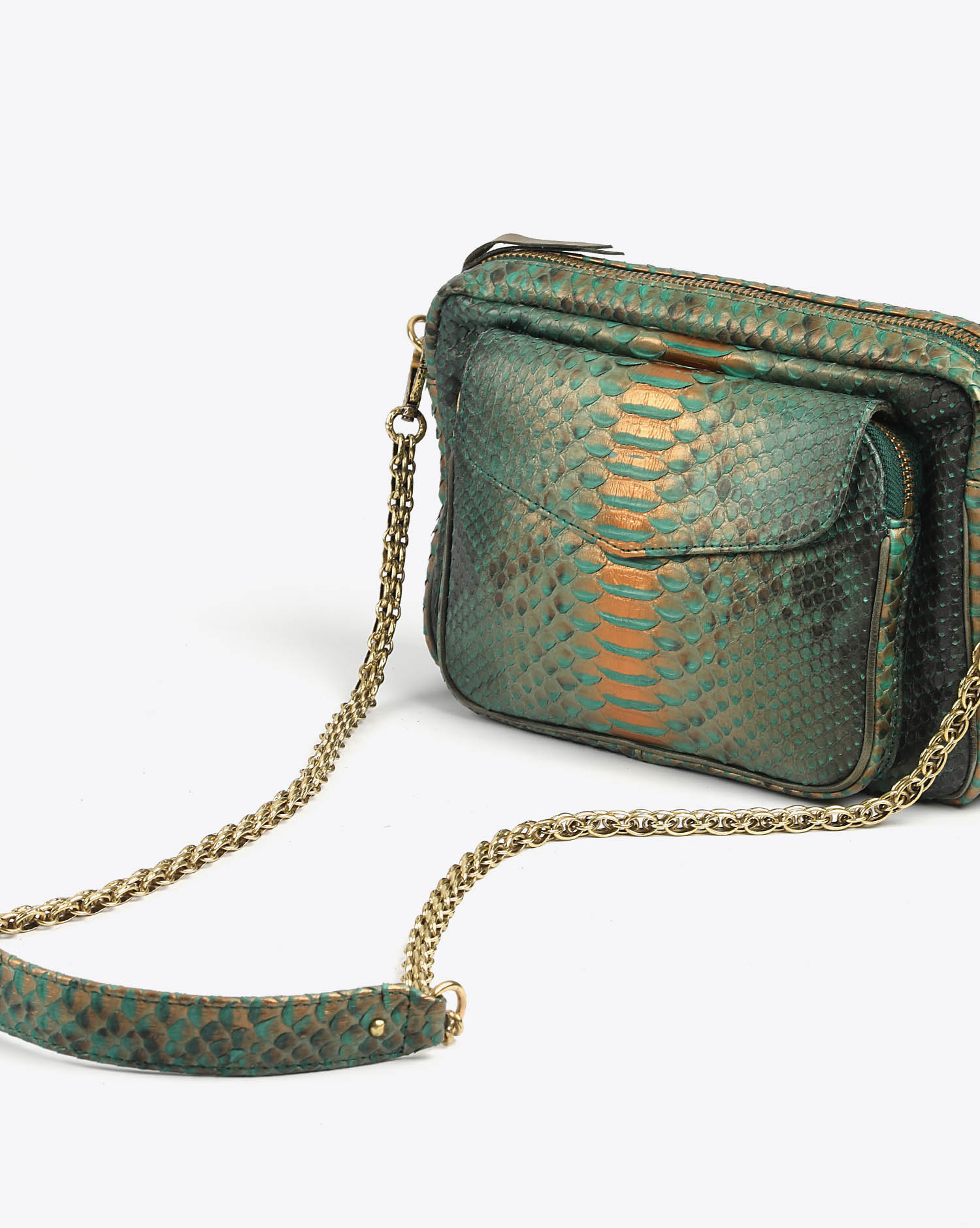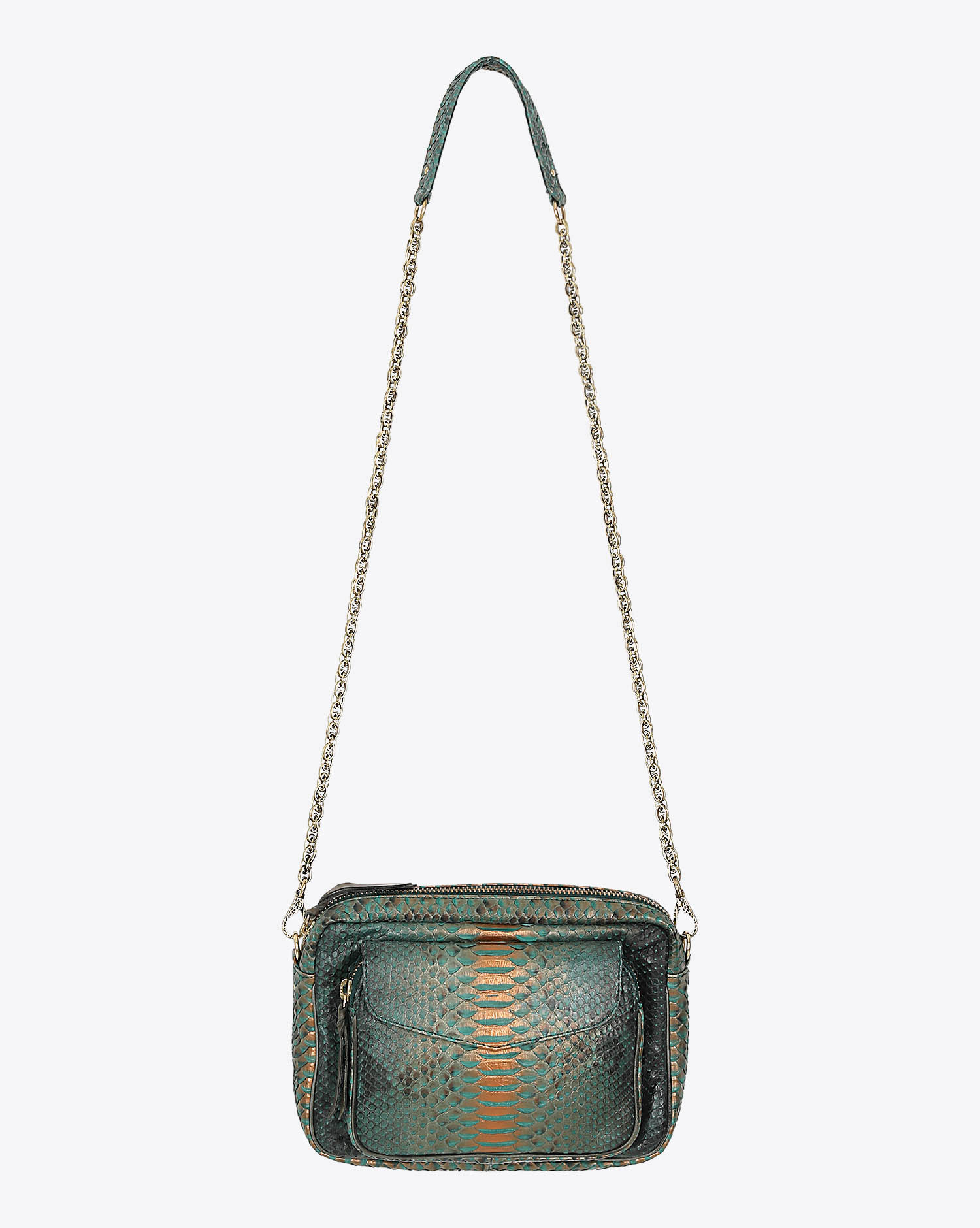 - Sac rectangulaire - Porté épaule ou crossbody - Bandoulière chaine amovible - Fermeture zip - Une poche zip à l'intérieur - Un compartiment zip avec rabat fermeture aimantée à l'avant - Une petite poche plaquée à l'avant - Composition: python - Doublure: 100% coton