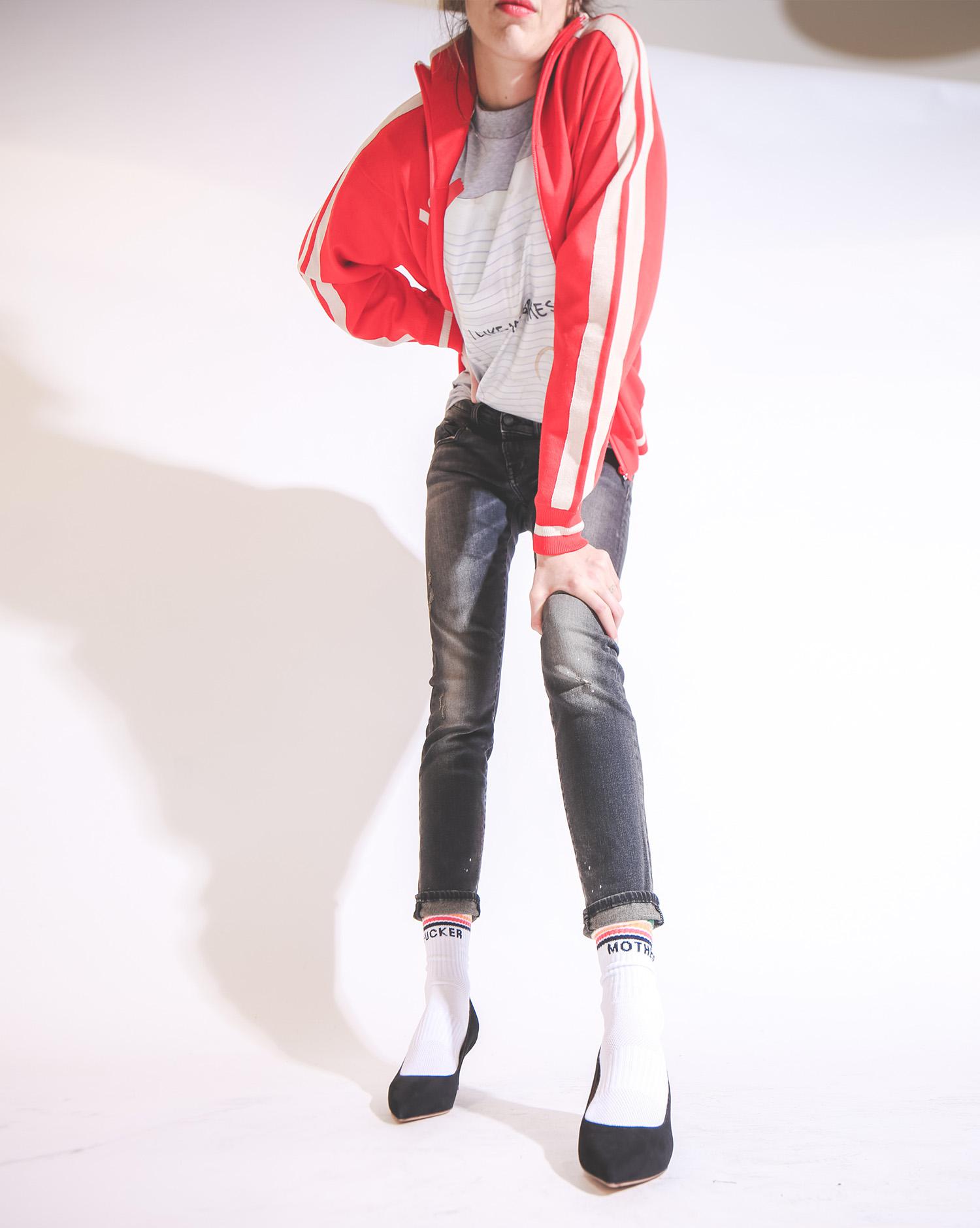 Col, poignets et bas de corps côtelés. Deux poches zippées sur les côtés.