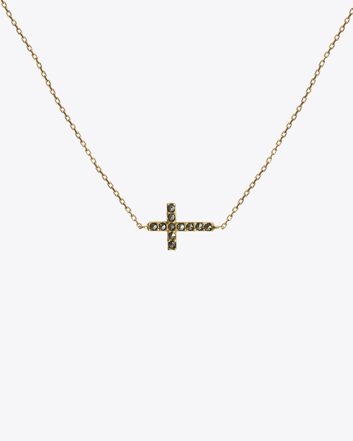 - Chaine avec croix pavée de pierres semi-précieuses - Collection "Antik" - Fermeture classique à ressort - Petite feuille en or au niveau du fermoir signature de la maison Feidt Paris - 3 anneaux de réglage de taille - Composition: Or jaune 9 carats - Poids: 1,19 grammes - Types de pierres: saphirs gris