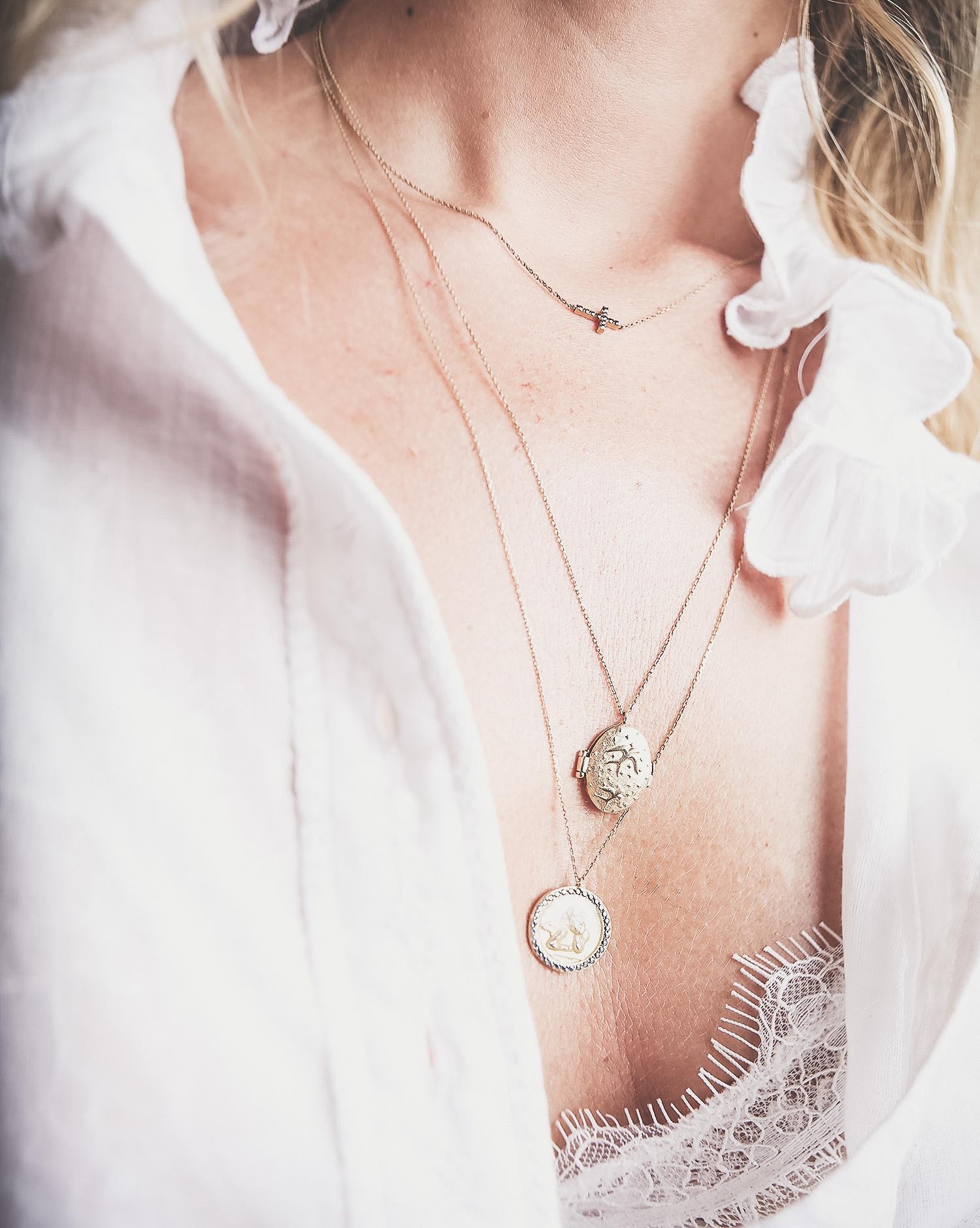 Tiré de la collection "Antik" de la marque Feidt, ce collier en or jaune se distingue par sa petite croix serti de pierres semi-précieuses. Porté au ras du cou, cette pièce discrète mais distinguée s'associera parfaitement avec d'autres colliers plus longs de la créatrice, et un chemisier en dentelle blanc.
