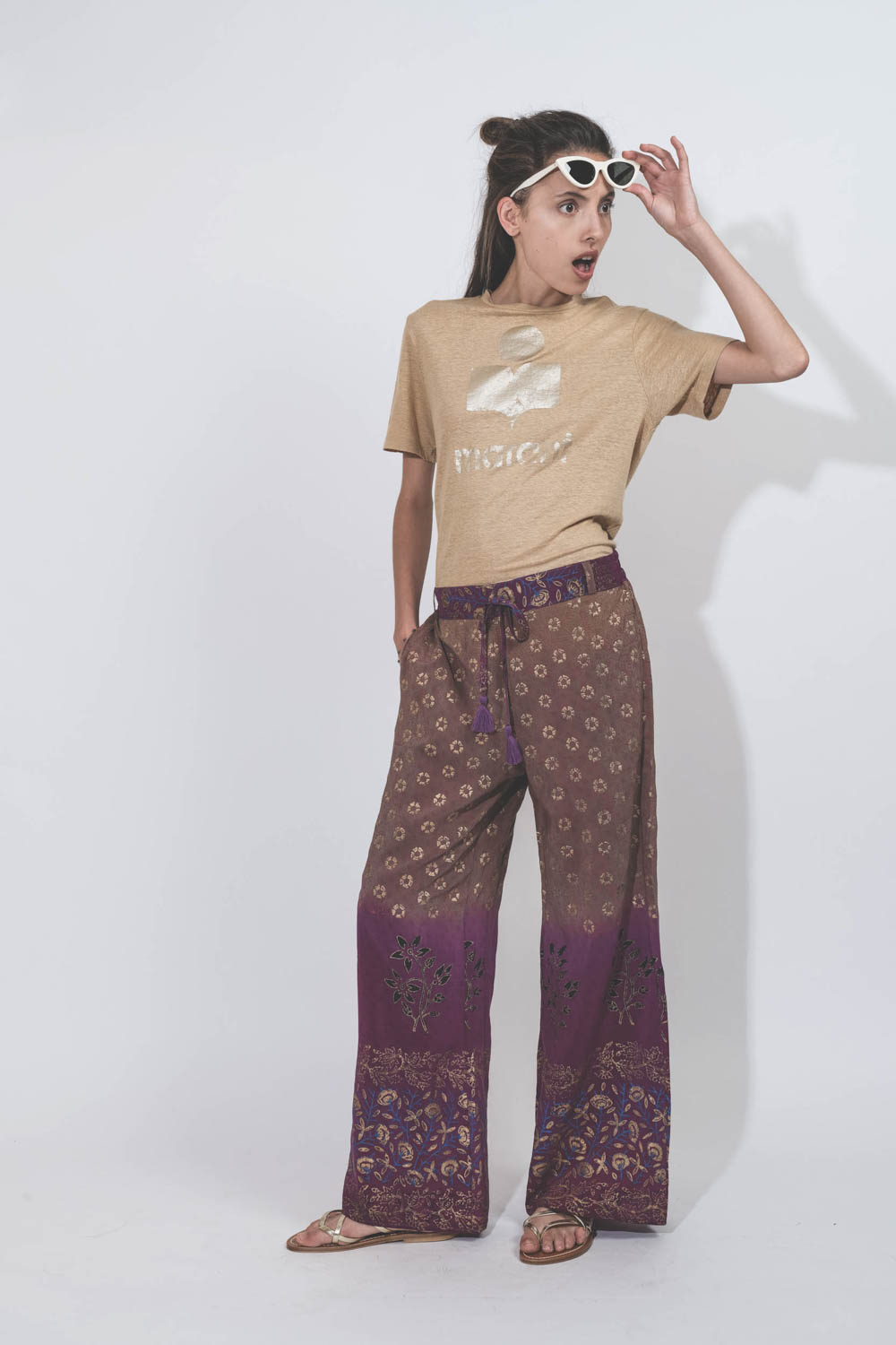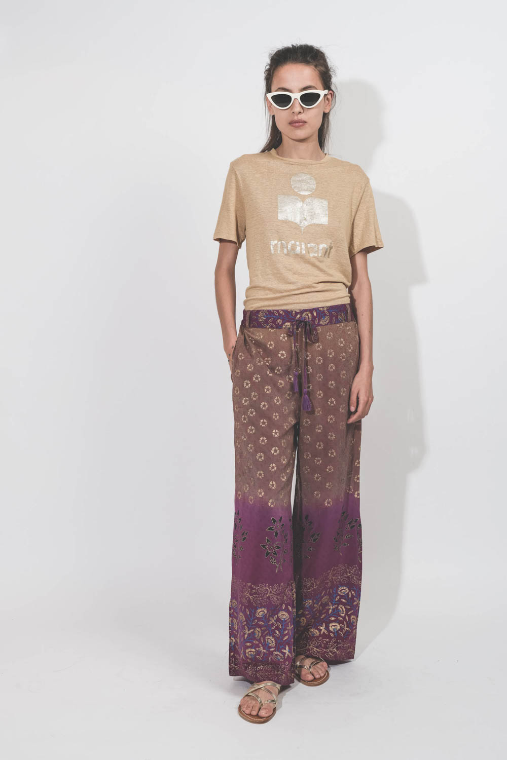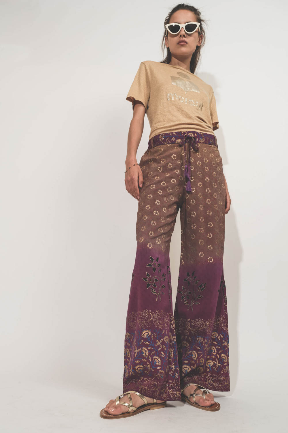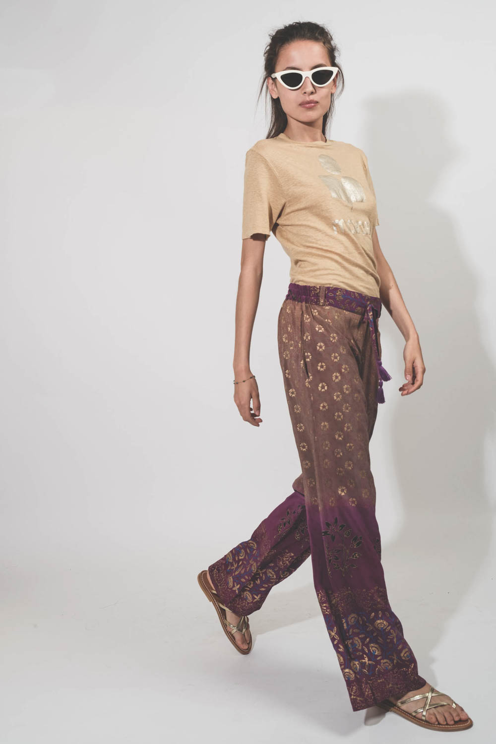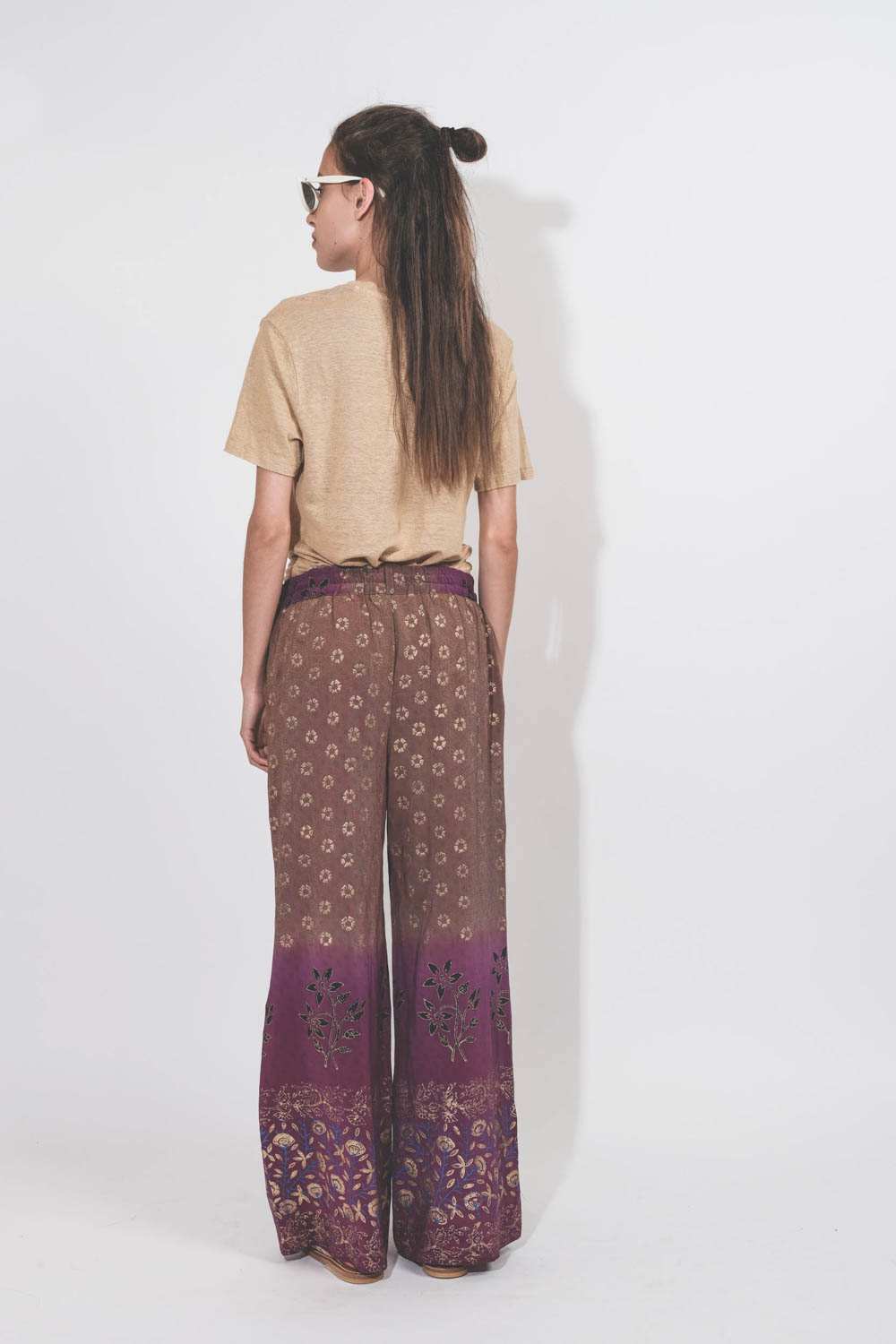 - Pantalon fluide - Taille élastique - Cordon à la taille avec pompon - Passants pour ceinture - Poches dans les coutures côtés - Réalisé à la main à partir d'un sari en crêpe de soie vintage - Modèle unique et numéroté - Composition: 100% soie