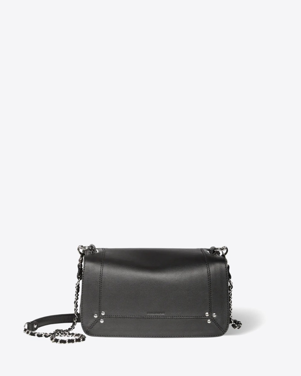 Icône du chic revisité, le Bobi S en cuir d’agneau noir avec chaîne argent signé Jérôme Dreyfuss se pose comme un mini sac au grand caractère : compact mais généreux, il révèle, sous un rabat aimanté, trois compartiments intelligemment pensés (dont un zippé), un miroir amovible et un anneau porte-clés, le tout dans une construction artisanale en agneau et chèvre doublée coton. Sa bandoulière mixant cuir et chaîne, réglable, offre un porté épaule ou cross-body selon l’humeur. Le contraste subtil entre la douceur du cuir noir et la froideur de la maille argentée apporte une allure urbaine et sophistiquée, idéale pour dynamiser une tenue monochrome ou apporter un twist métallique à un look décontracté.