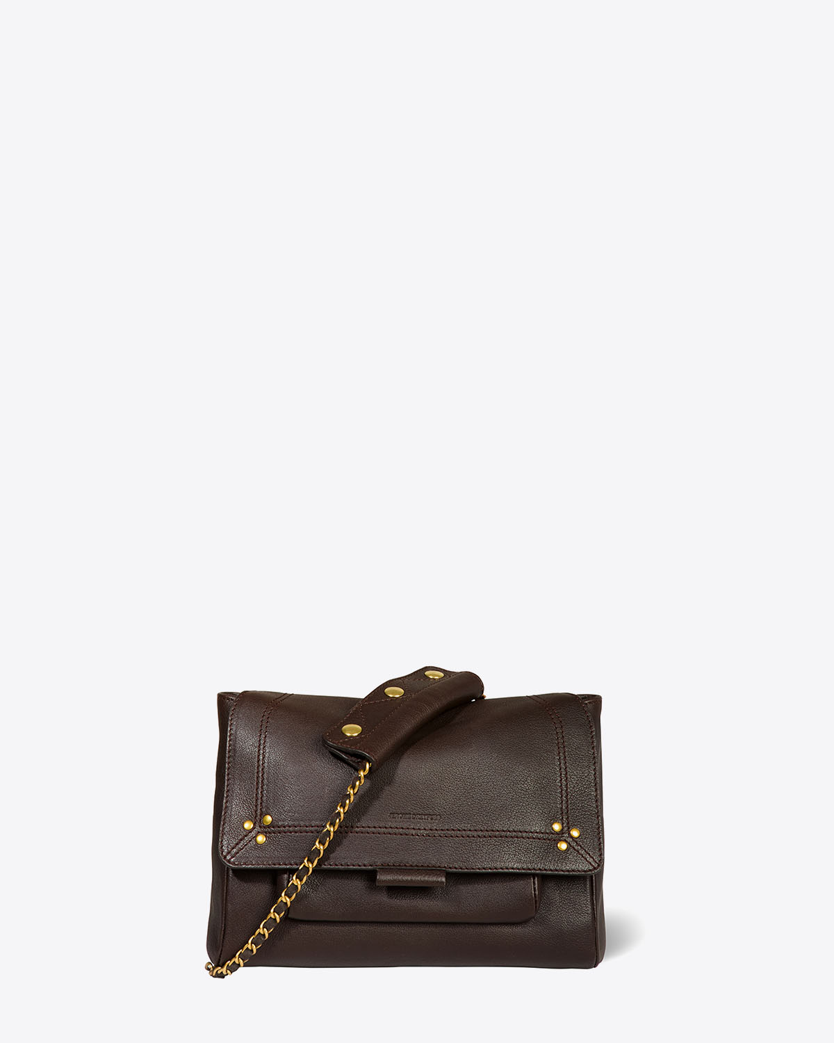 Sa bandoulière chaîne et cuir s’ajuste pour un porté épaule ou en travers du corps, tandis que la patte en cuir sur l’épaule garantit un confort optimal. Fonctionnel sans jamais sacrifier le style, il offre un compartiment principal spacieux, plusieurs poches zippées et une organisation intuitive. Les petits rivets métalliques et le lien porte-clés à l’intérieur signent l’identité de la maison Jérôme Dreyfuss.