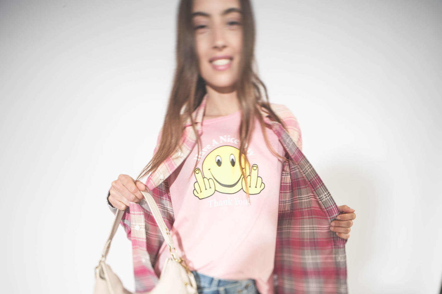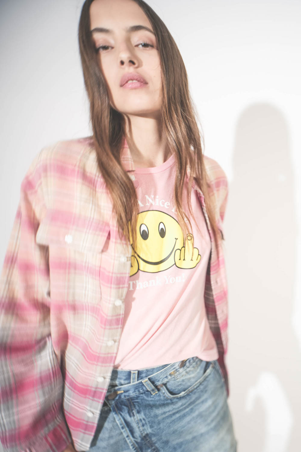 Fidèle à son humour légendaire et à sa douce provocation, le créateur Chris Leba dévoile un nouveau t-shirt pour le printemps, sensibles du premier degré s'abstenir. Ce t-shirt "have a nice day" rose montre un smiley comme on les connaît tous, seule particularité, ce gentil smiley fait deux "f***" avec ses mains ! Typique de la marque R13 qui adore le côté rock et provoc des années 90. Vous avez peur qu'on vous embête au bureau ou dans le métro ? C'est peut-être le t-shirt qu'il vous faut ! A porter avec modération avec un short en jean crossover et des sandales made in Saint-Tropez !