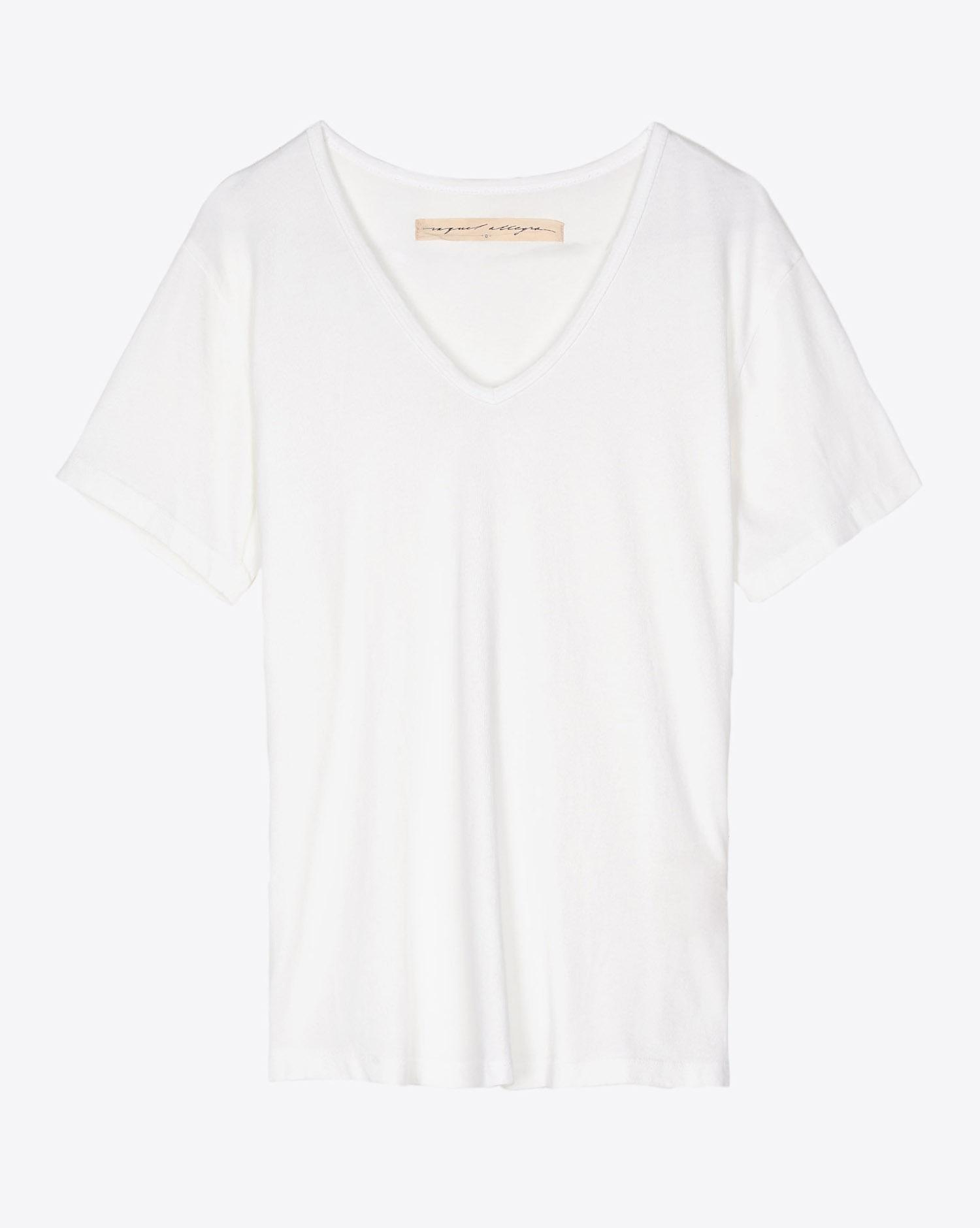 Que vous soyez rock, bohème ou streetwear, le tee-shirt à manches courtes blanc est un indispensable de votre garde-robe ! Notre conseil pour porter ce modèle à col V Raquel Allegra ? L'associer à une longue jupe blanche effet dentelle, un paire de boots esprit santiags couleur ciment, et une veste en denim bleu clair que l'on porte aussi bien sur les épaules que nouée autour de la taille.